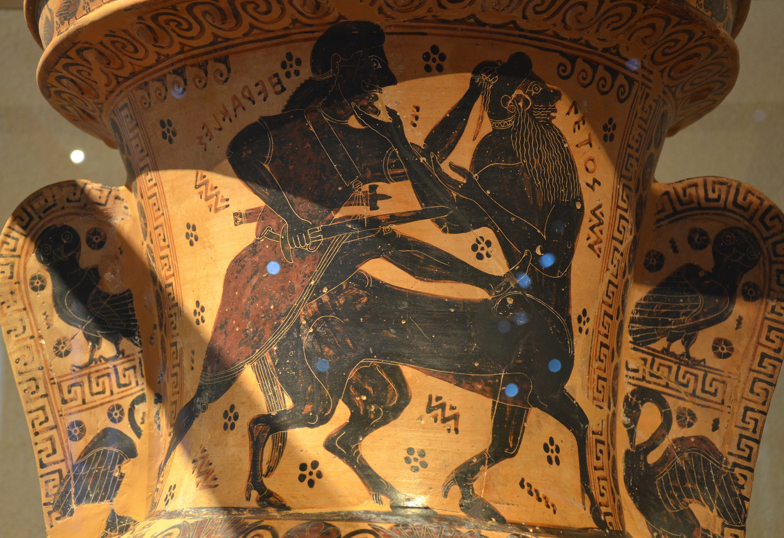 Attic black-figure funerary amphora depicting Heracles wrestling down the Centaur Nessos, from a tomb in Athens, 620-610 BCE. (National Archaeological Museum of Athens)