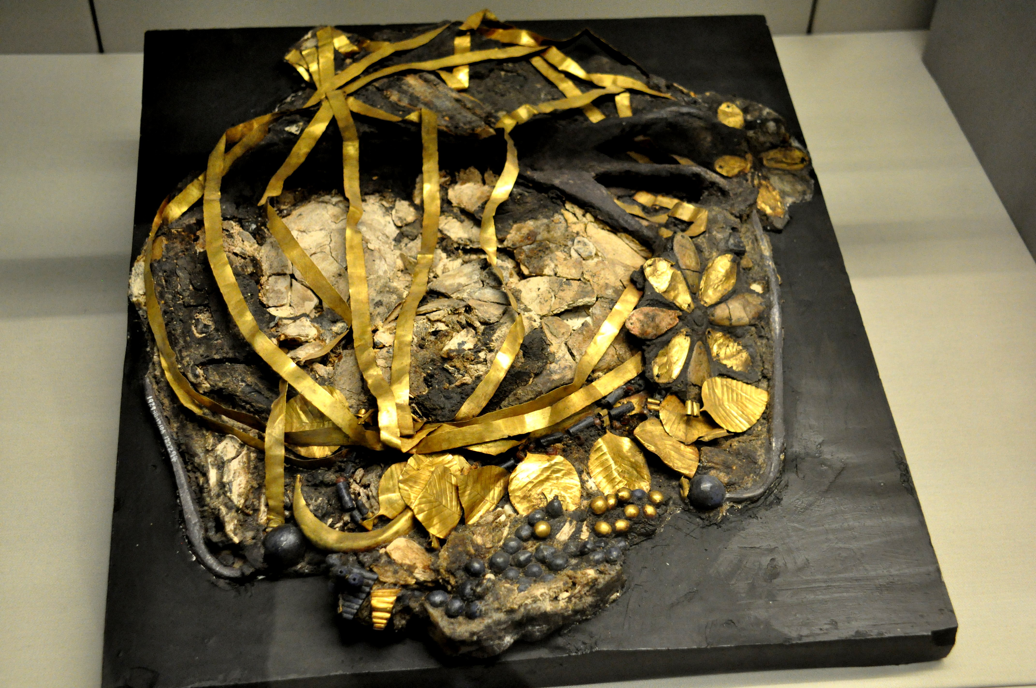 This crushed skull and its surrounding elaborate headdress was excavated (en bloc) from one of the royal cemeteries at Ur, the Great Death-Pit. This is a head of one of queen/princess Pu'Abi's female attendants. Early dynastic period, circa 2600 BCE. From Ur, Mesopotamia, Iraq. (The The British Museum, London).