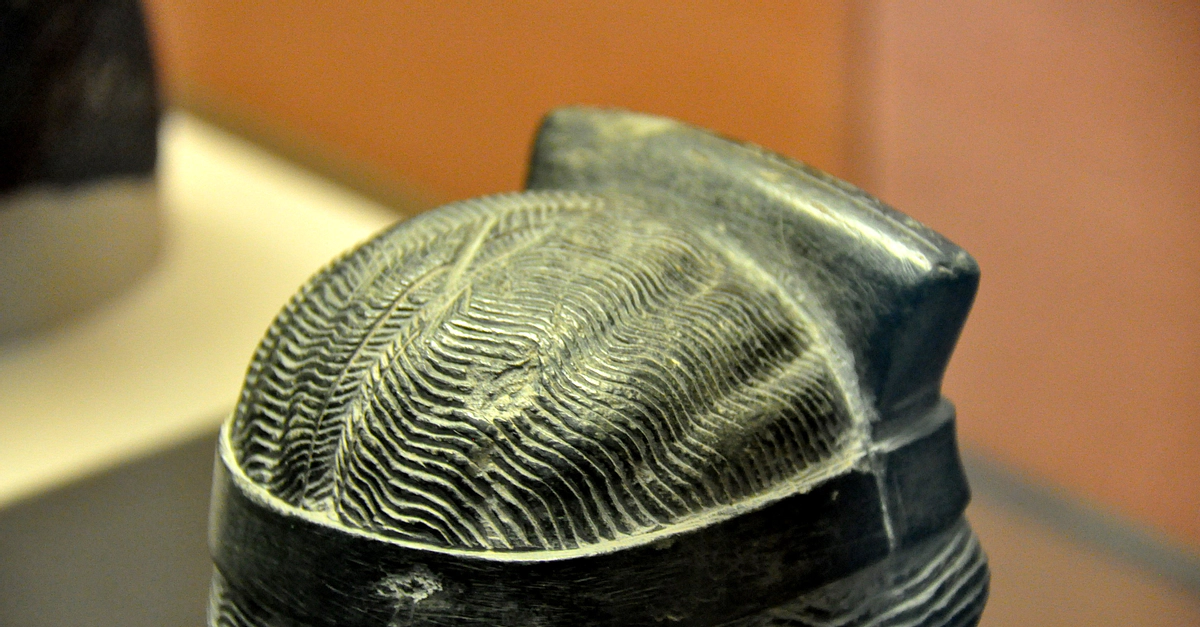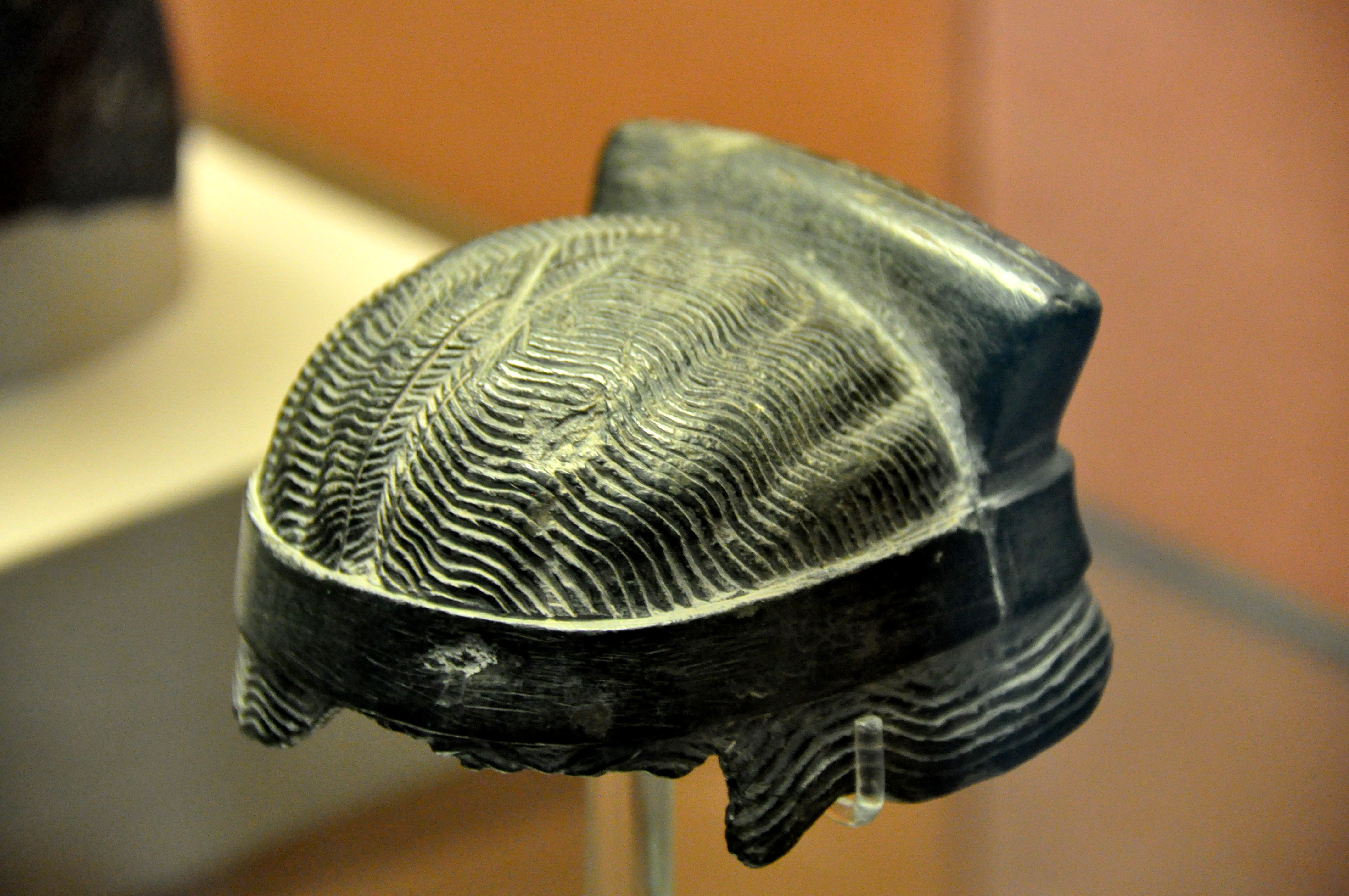 On the back of this piece, there are cuneiform inscriptions that mention that this headdress was commissioned by a Bau-Ninam on behalf of King Shulgi of Ur. It is most likely that this headdress was to be put on the god Lamma. Neo-Sumerian period, Ur III, reign of King Shulgi, 2094-2047 BCE. From Mesopotamia, Iraq. (The British Museum, London).