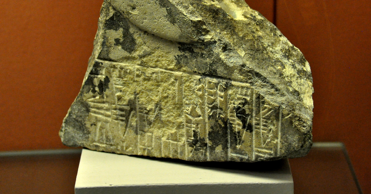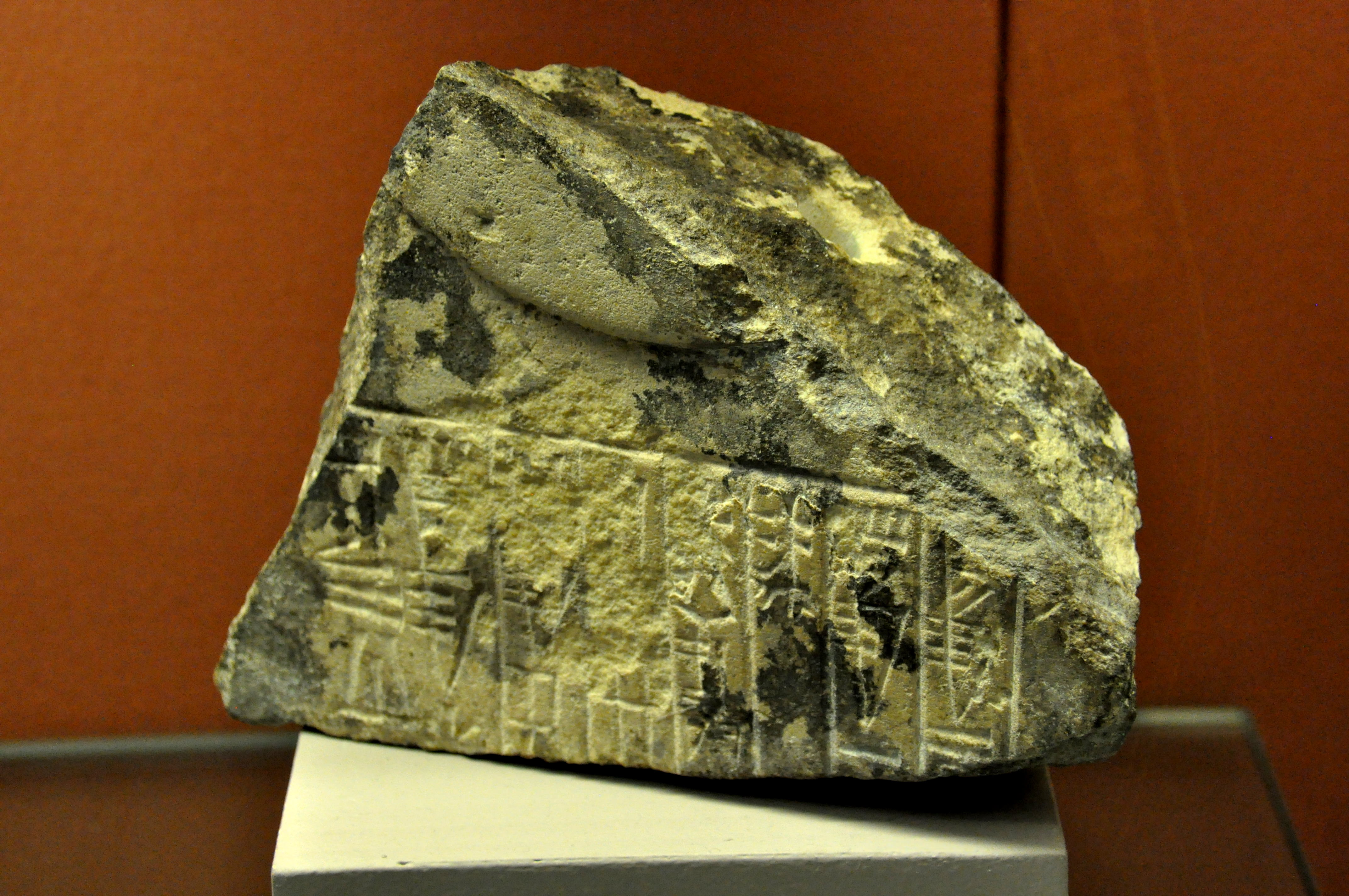 The cuneiform inscriptions on this fragment of a stone monument mention the name of Utu-Hegal, King of Uruk. 2125 BCE, from Ur, Mesopotamia, Iraq.
