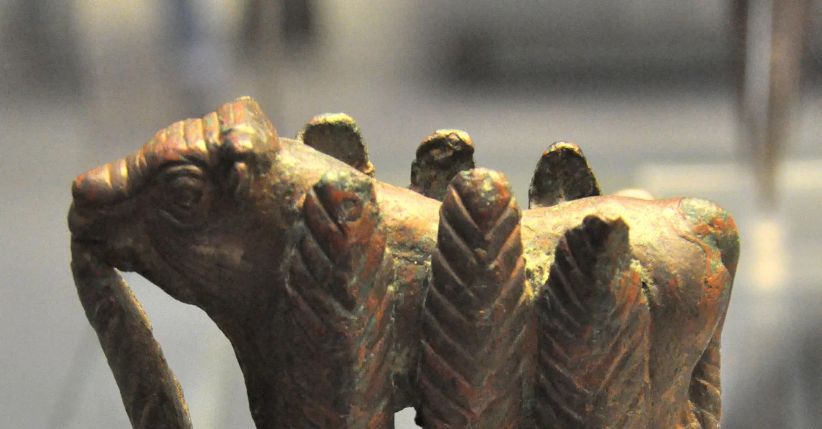 This copper alloy foundation deposit records the rebuilding of the temple of the god Nanshe in the city of Sirara (modern Zerghul, southern Iraq) by Gudea, ruler of Lagash. It features a bull in a reed marsh. C. 2130 BCE, probably from Sirara, southern Mesopotamia, Iraq. (The British Museum, London).
