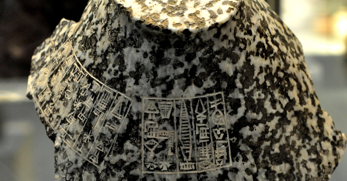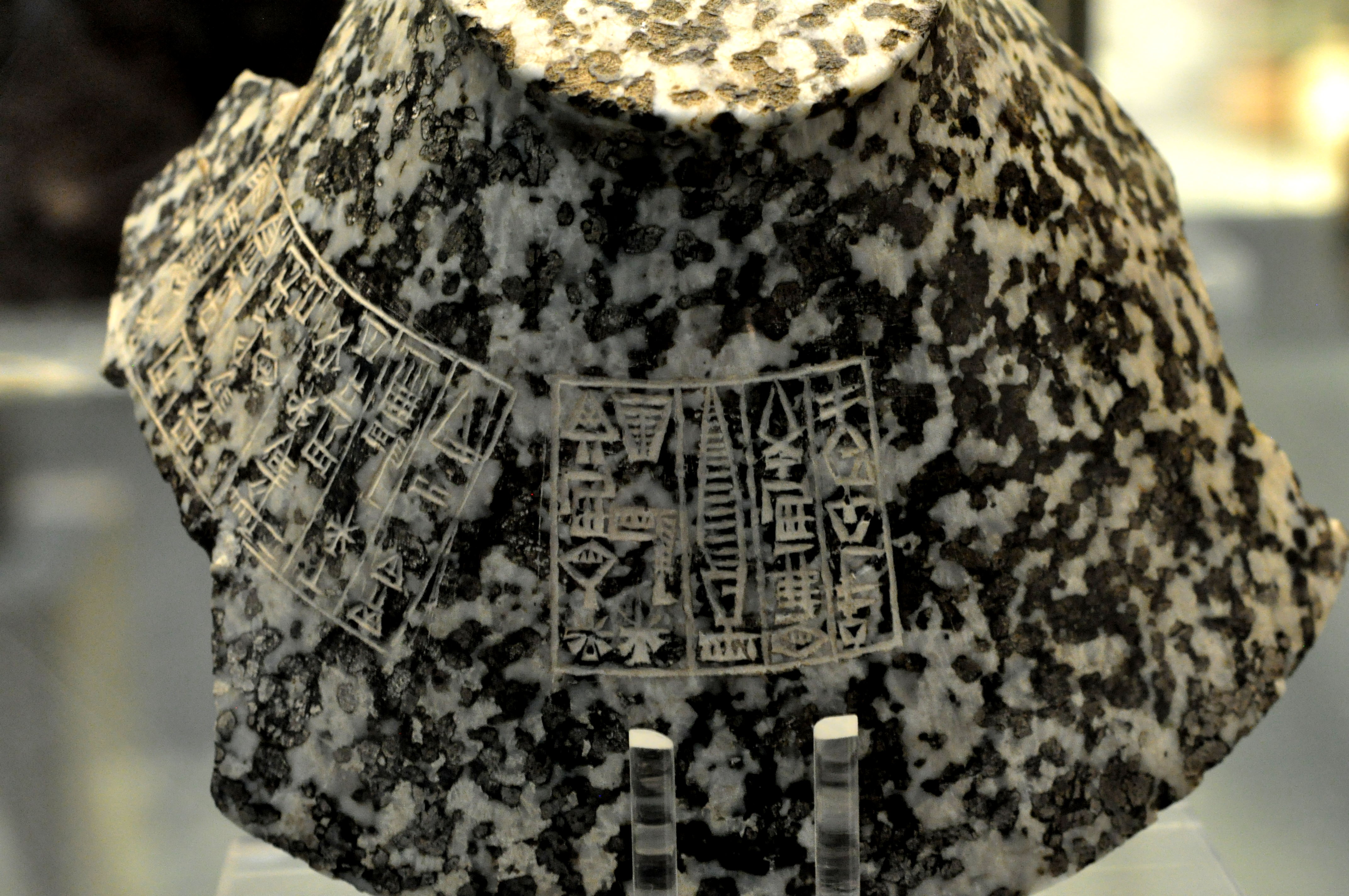 This stone bowl has two sets of cuneiform inscriptions. The first one says that the bowl was booty brought to Mesopotamia from Magan (modern Sultanate of Oman) by the Akkadian king Naram-Sin (2254-2218 BCE). The second inscription mentions that later, the daughter of King Shulgi of Ur III, dedicated the bowl to the moon god Sin at Ur (2094-2047 BCE). (The British Museum, London).