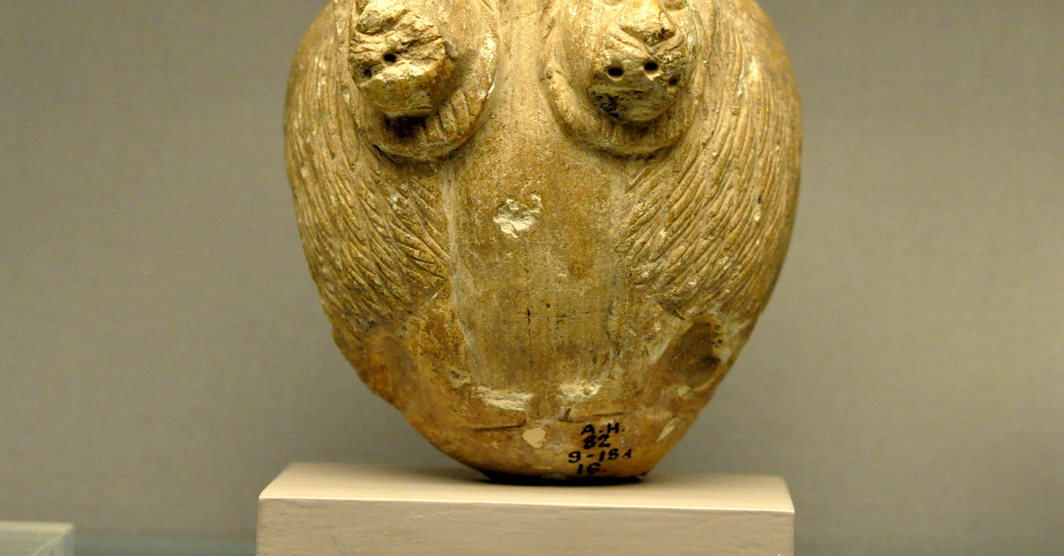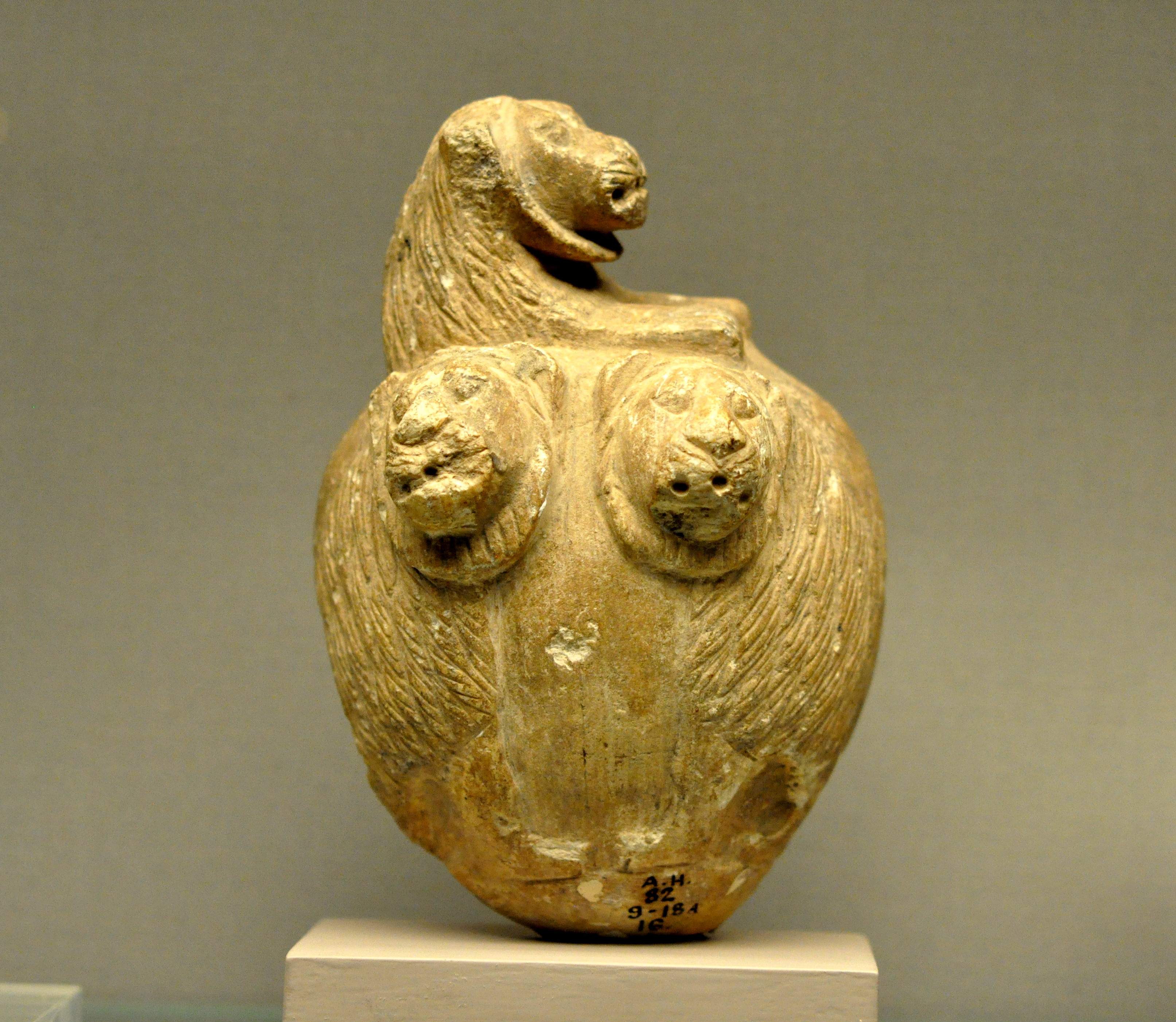 This is a symbolic weapon which was dedicated to a temple in order to receive gods' blessings. The lions' heads represent power and reflect the fact the donor was a royal person. Early dynastic period, 2500 BCE, from Sippar, Mesopotamia, Iraq.