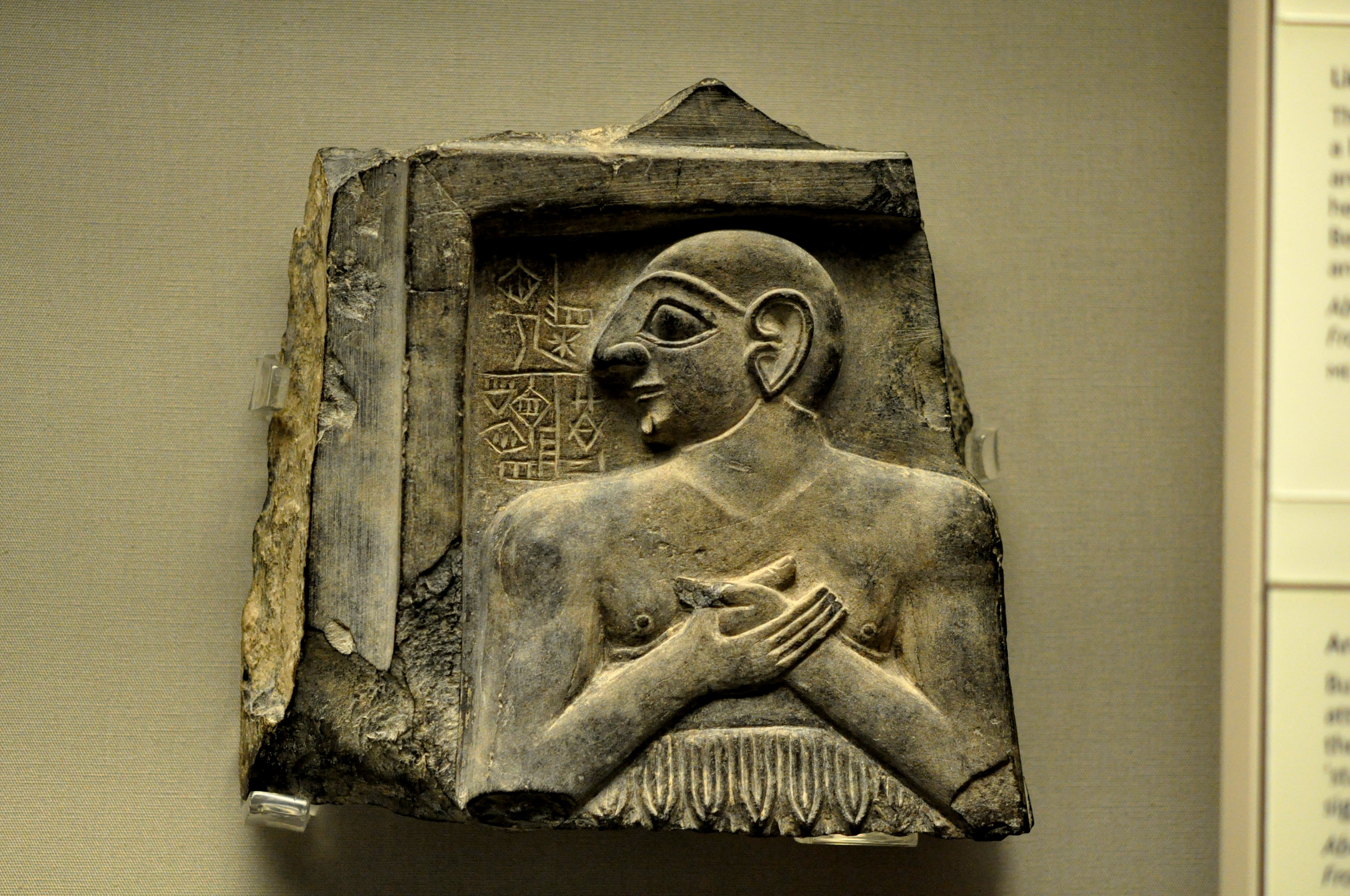 The inscriptions on this stone plaque mention the name of Enannatum I, king (or ruler) of Lagash. The plaque was fixed to a wall of a shrine or temple. The king's hands are folded in a worship position. c. 2420 BCE, from Girsu (modern Tell Telloh), Mesopotamia, Iraq. (The British Museum, London).