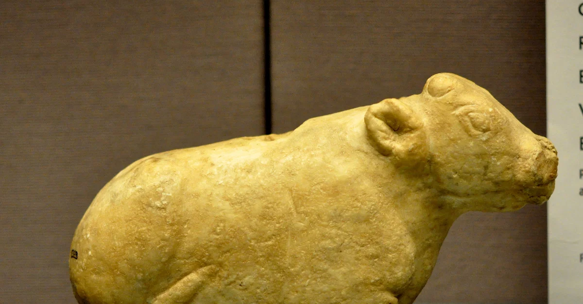 There is a hole on the back of this stone calf for vertical posts or other attachments. Late Uruk period, 3300-3000 BCE, from Ur, Mesopotamia, Iraq. (The British Museum).