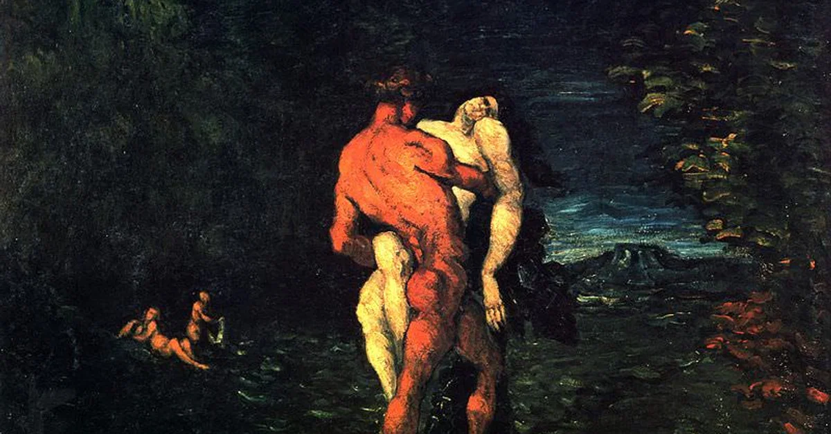 An 1867 painting in oils, The Abduction by Paul Cézanne (1839-1906), the French post-impressionist artist. This painting is thought to depict Hercules rescuing Alcestis from the underworld (another theory is that this represents the abduction of Persephone by Hades). The distortion of the figures adds notable drama to the scene. Painted in Émile Zola's house and was first owned by him. (Sammlung Keynes Collection, U.K.)