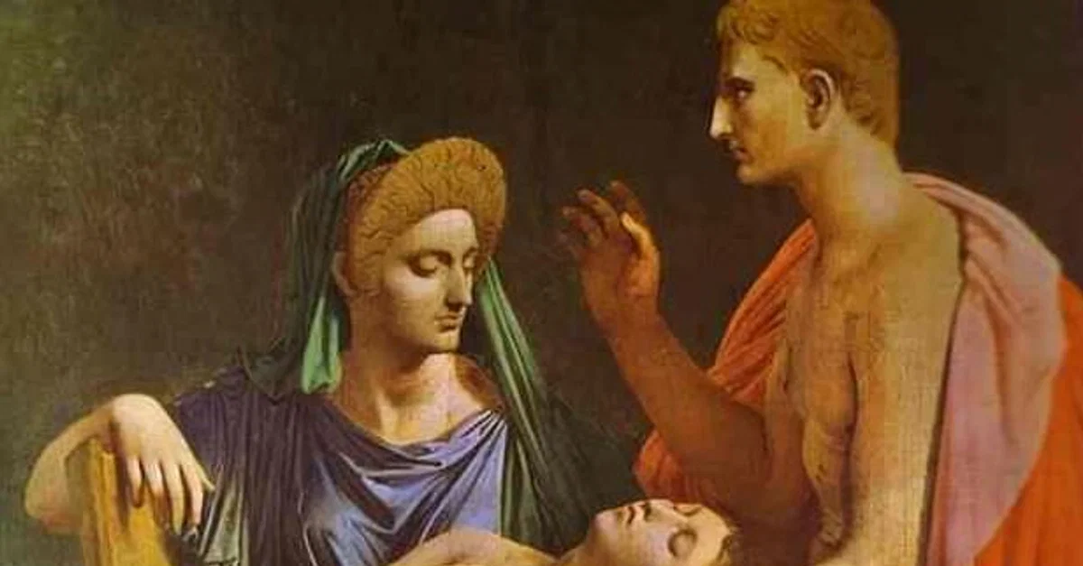 Painting by Jean Auguste Dominique Ingres, 1812 CE, Royal Museum of Fine Arts, Belgium. In the Aeneid, Aeneas sees Marcellus in the Underworld and is saddened by Marcellus' early death. When this passage is read to Augustus (Marcellus' uncle) and Octavia (his mother), Octavia faints, as seen here.