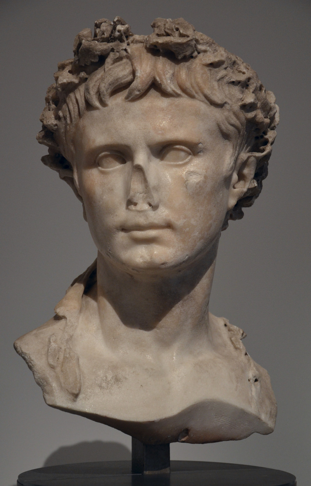 Bust of Augustus wearing the oak crown (corona civica) discovered on the site of the Roman villa of Chiragan (France), 19-18 BCE. (Toulouse, Musée Saint-Raymond)