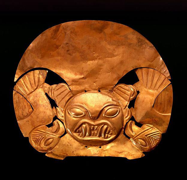 A Moche gold headdress (1-700 CE). The figure represents a fanged deity, a common subject in Moche art. (Larco Museum, Lima)