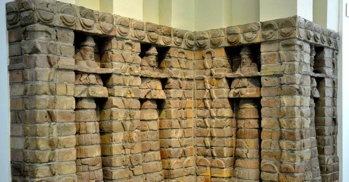 Part of the facade of the temple of Inanna at Uruk. There are standing male and female deities in alternate niches. Each figure holds a vessel in his/her hands and pours life-giving water onto the earth. The cuneiform inscriptions on the bricks mention the name of the Kassite ruler Karaindash as the person who ordered the building of this temple. From Uruk, southern Mesopotamia, modern-day Iraq, c. 1413 BCE.