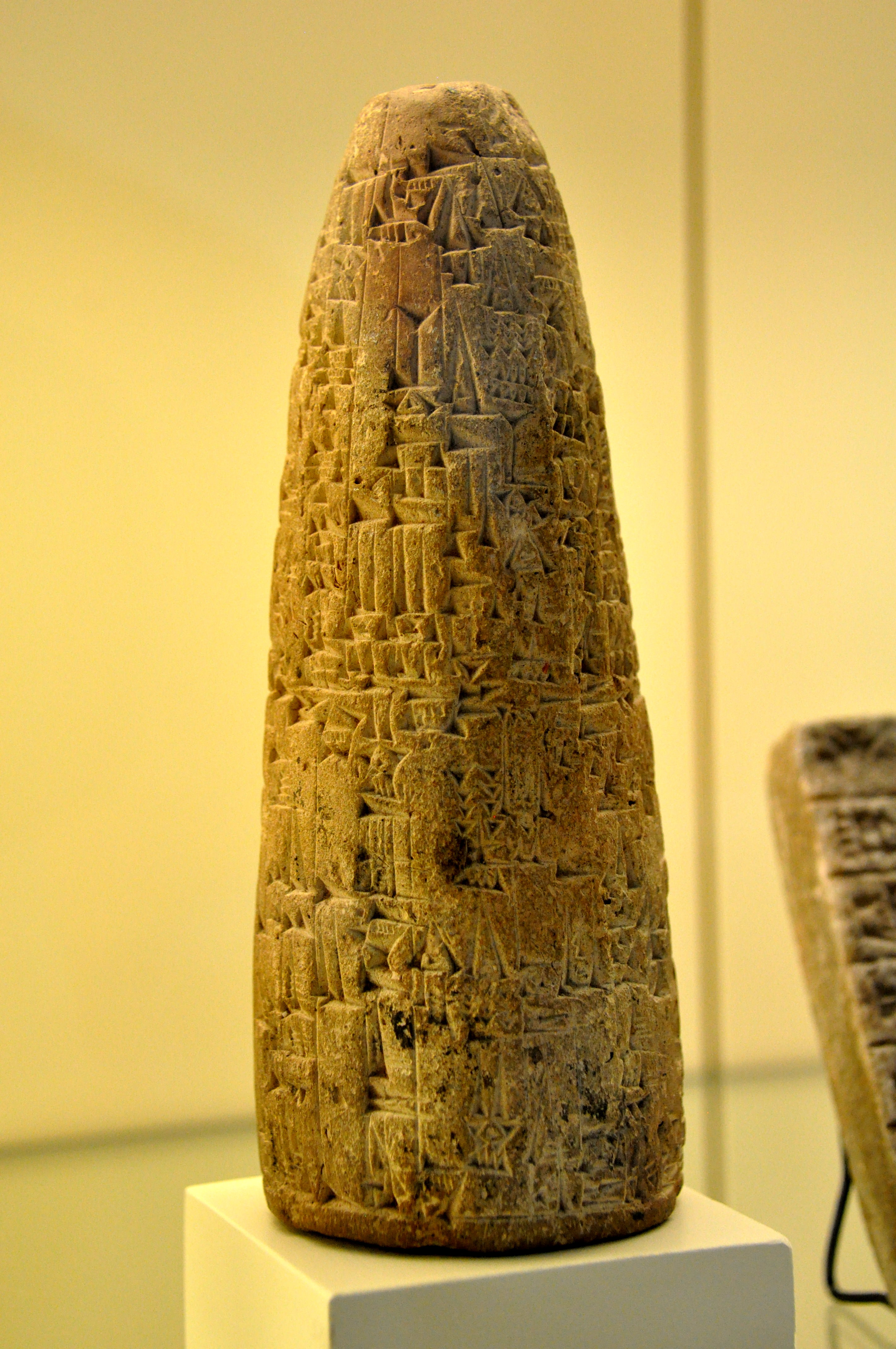 A foundation cone with cuneiform inscriptions. The name of the king Sin-Iddinam of Larsa appears. Isin-Larsa period, 1849-1843 BCE. From southern Mesopotamia, Iraq. The Pergamon Museum, Berlin).