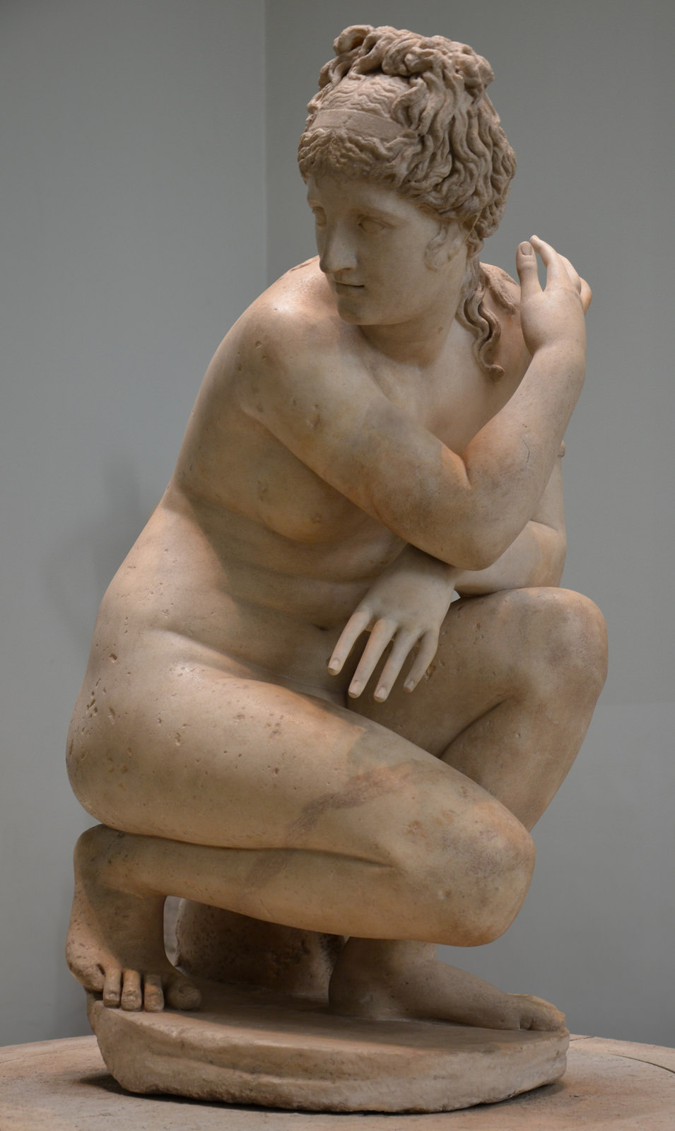Marble statue of a naked Venus crouching at her bath, 2nd century CE (Antonine period). It is a Roman version of an original from the Hellenistic period. (British Museum)
