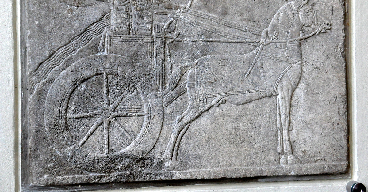This small alabaster wall relief was part of a larger relief that represents the military campaign of the Assyrian king Ashurbanibal against the Elamite city of Hamanu. There is an Assyrian chariot with charioteer and archer, protected from enemy attacks by shield bearers. Neo-Assyrian period, 650 BCE. From Nineveh (modern Mosul, Ninawa Governorate), northern Mesopotamia, Iraq. (The Pergamon Museum, Berlin).