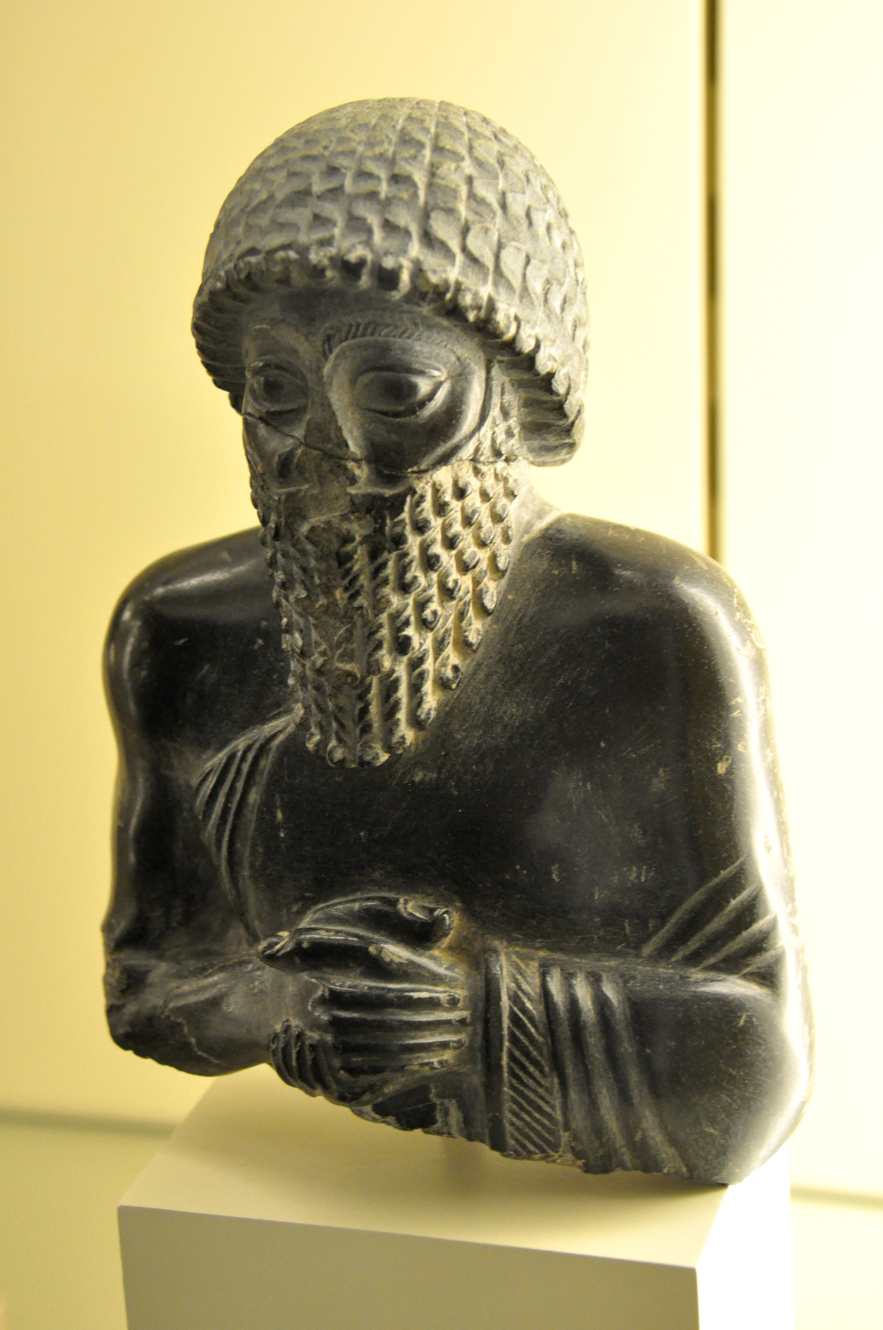 The cuneiform inscriptions on the back of this small diorite statue (height 18 cm) read, "Dedicated to the god Ningizzida, his god, by Ur-ningirsu, priest-prince of Lagash, son of Gudea, priest-prince of Lagash." This bearded man is Ur-ningirsu. The mouth and the nose appear to be damaged on purpose. Probably, Ur-ningirsu dedicated this statuette of himself to the temple of Ningizzida. Ningizzida was the Sumerian god of the underworld and the guardian of the gate of heaven. Neo-Sumerian period, 2117 BCE. From southern Mesopotamia, Iraq. (The Pergamon Museum, Berlin).