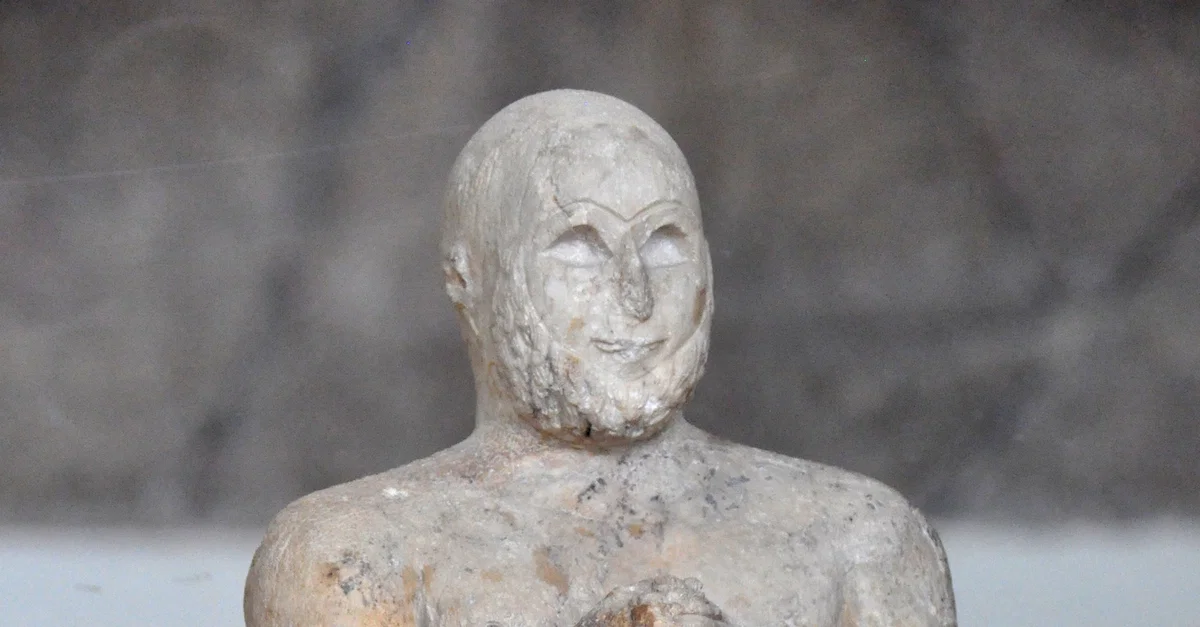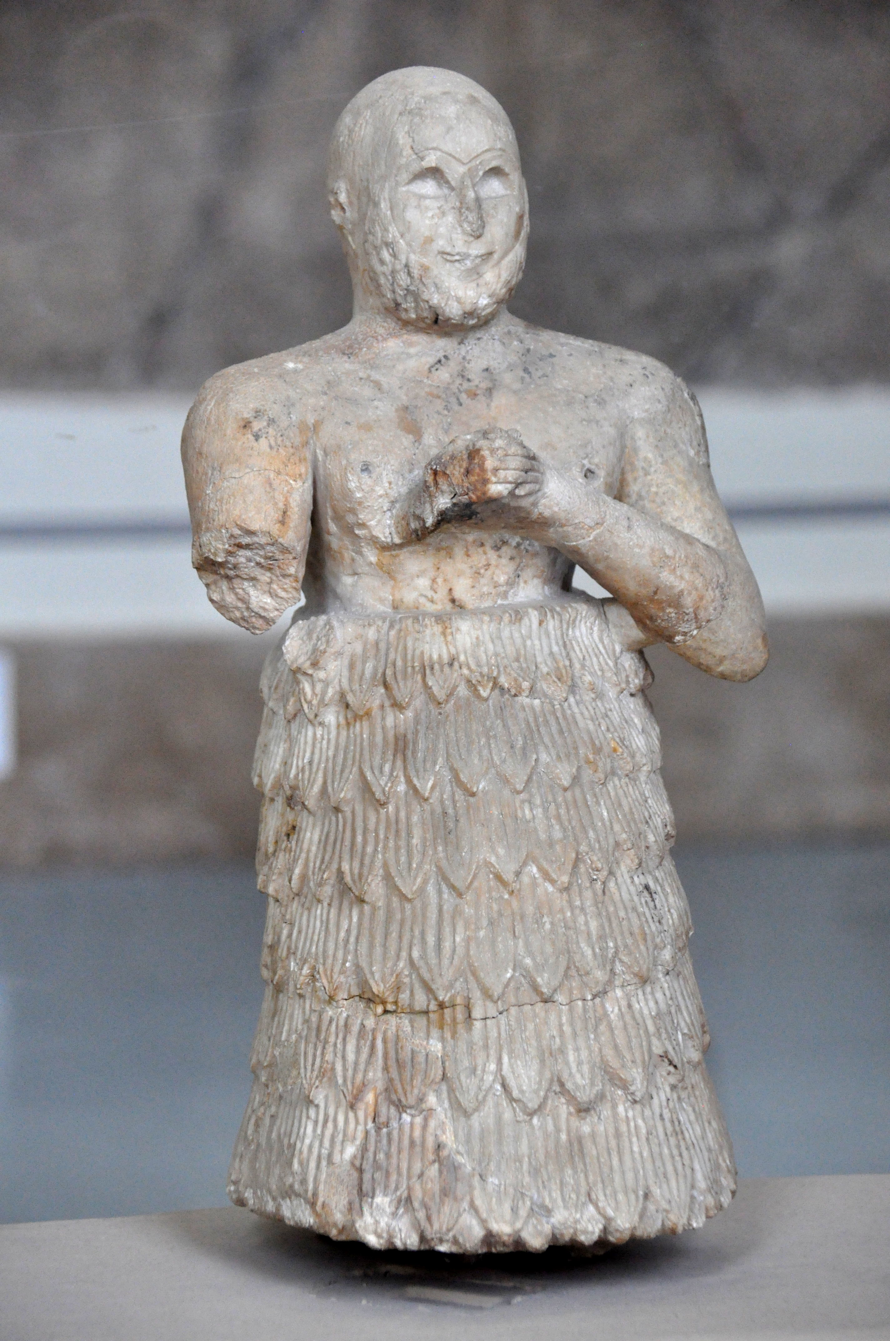 Alabaster statuette (height: 46 cm), depicting a bearded bald-headed man, most likely a priest/man of a high rank. He clasps his hands in a prayer attitude. The upper part of the body is naked, while the lower half is covered by a sheepskin skirt. It was found in the anteroom to the cella of archaic Ishtar Temple in the city of Ashur. From Ashur, northern Mesopotamia, Iraq. Early dynastic period, c. 2400 BCE.