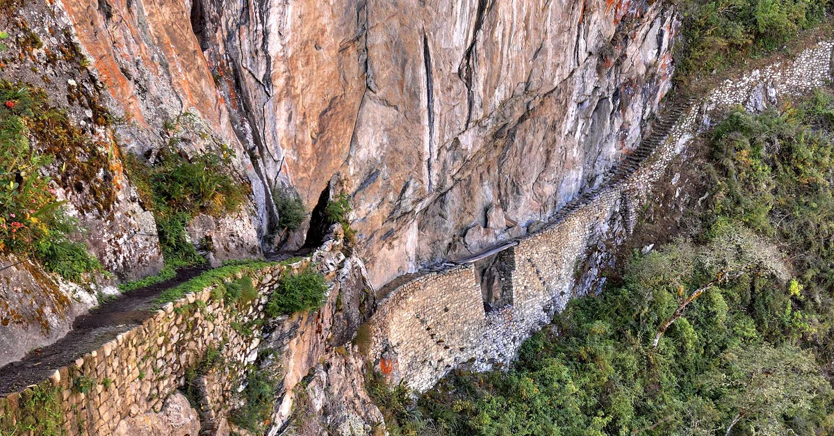 An Inca mountain road with bridge, approaching Machu Picchu.