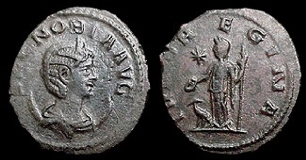 Zenobia Antoninianus coin reporting her title, Augusta and showing her diademed and draped bust on a crescent with the reverse showing a standing figure of Ivno Regina, holding a patera in her right hand, a sceptre in her left, a peacock at her feet, and a brilliant star to the right. 271-272 CE.