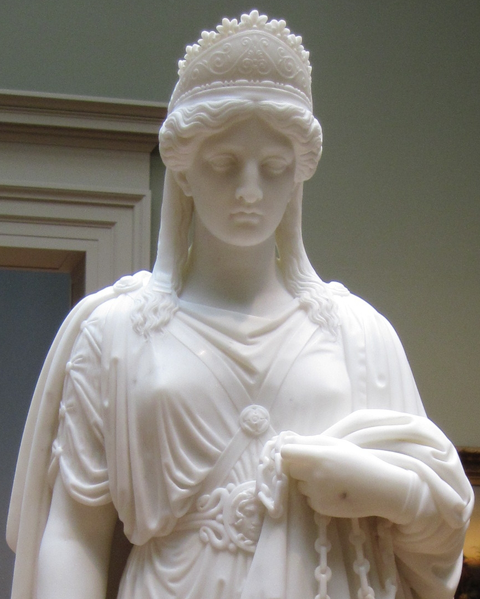 Queen Zenobia of the Palmyrene Empire, 3rd century CE, rebelled against the Roman Empire and may have been paraded by Emperor Aurelian through the streets of Rome in golden chains. Marble sculpture by Harriet Goodhue Hosmer, 1859 CE, now in the Huntington Library, San Marino, CA.