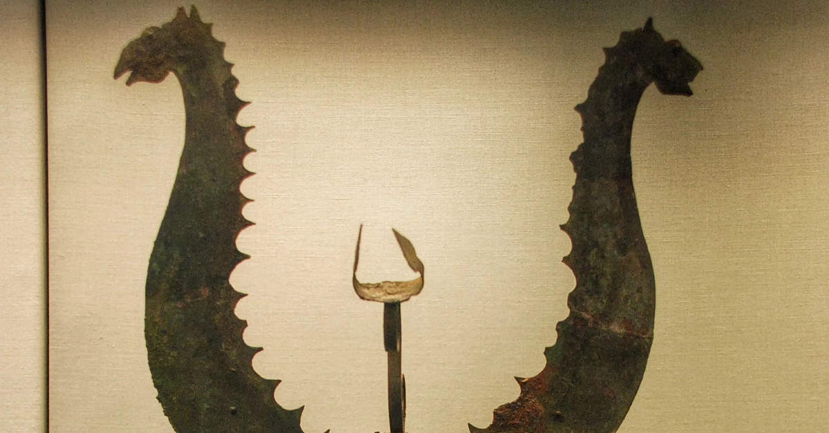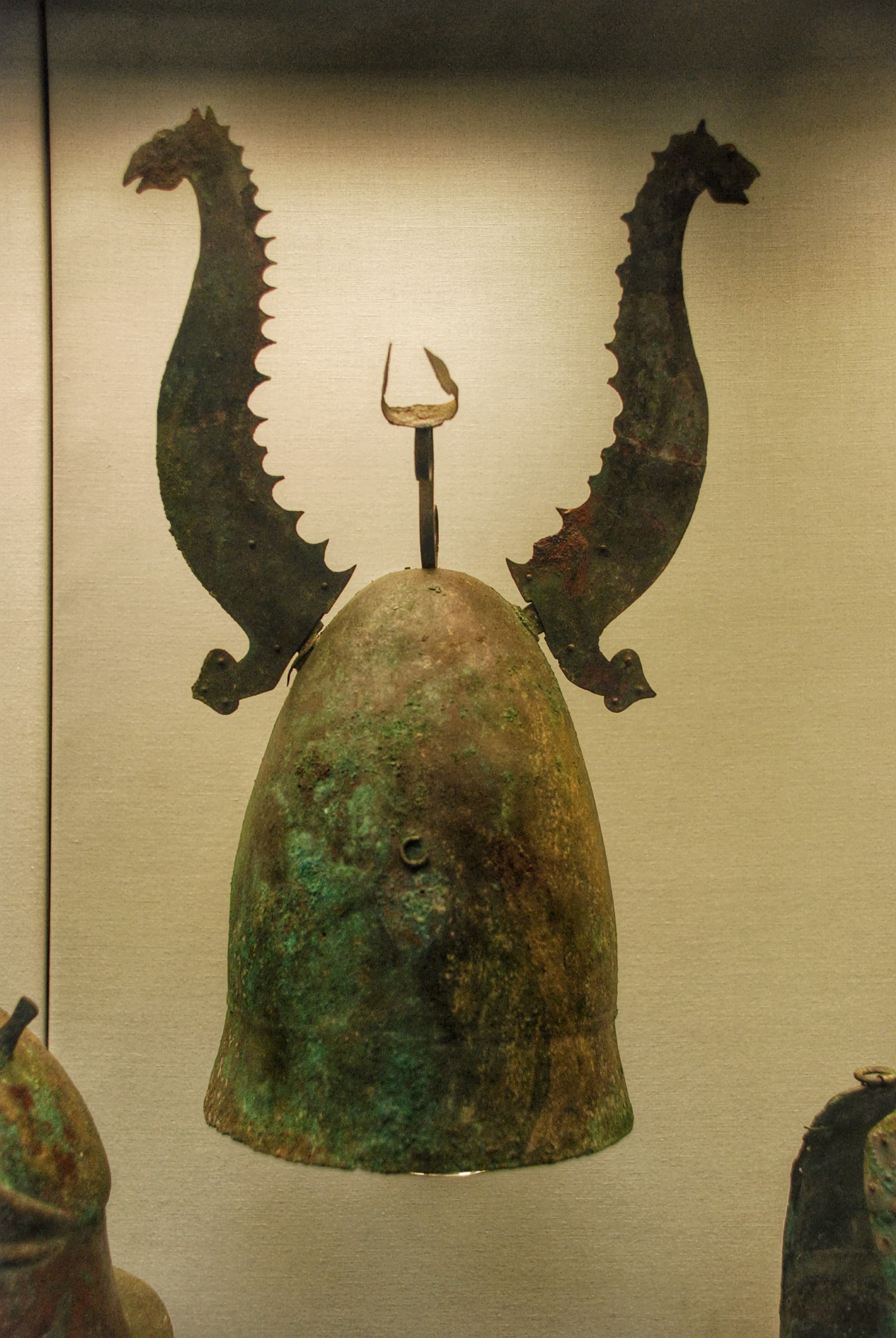 This bronze helmet has a crest with detachable horns shaped like horse-headed sea-monsters. The origin is unclear, it is perhaps a Messapian helmet from southern Italy. Circa 325-275 BCE. Castellani Collection, Bronze 2824, British Museum, London, UK.