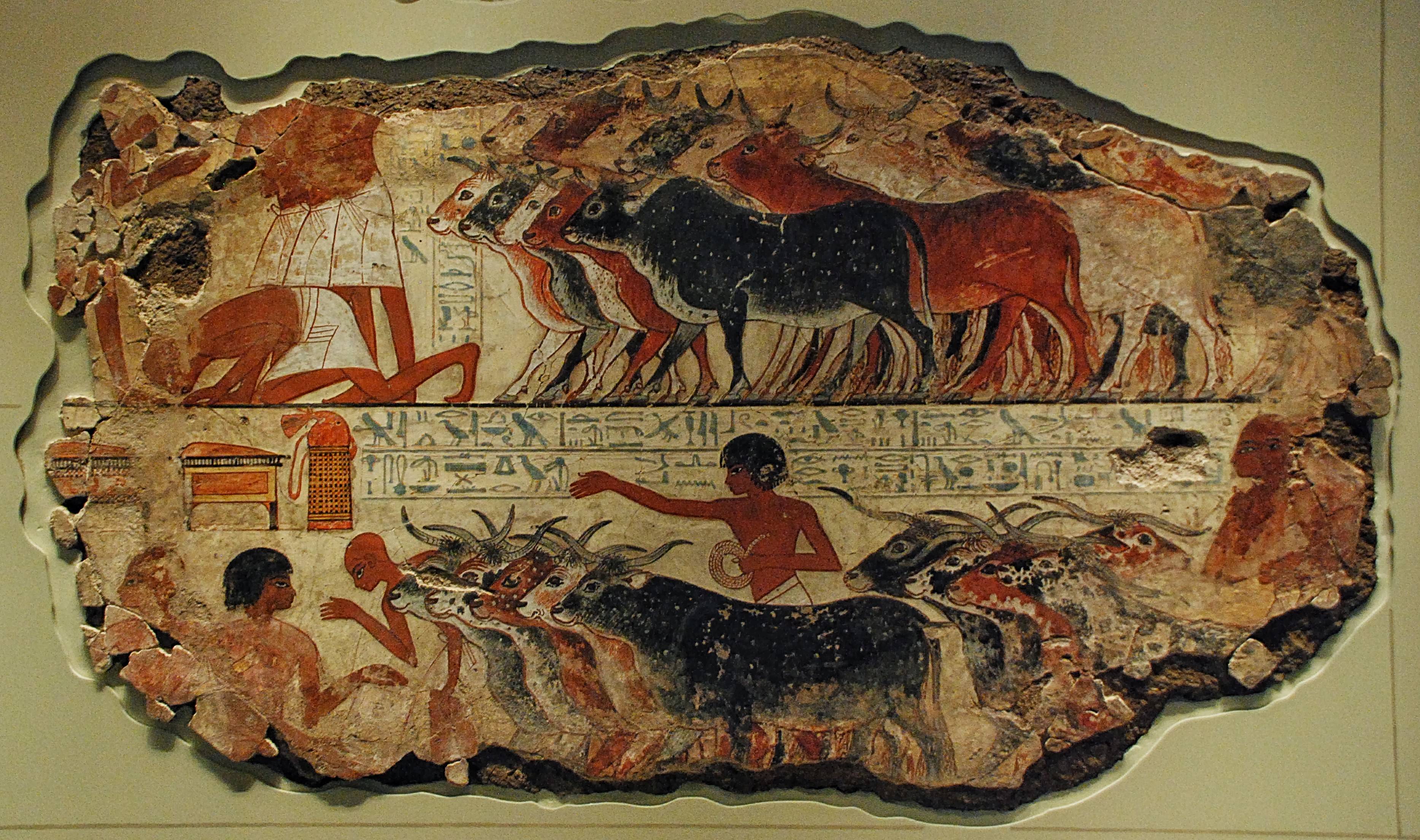 This painting shows Egyptian cattle being counted by scribes. The painting found part in the tomb of Nebamun (c. 1350 BCE), an wealthy Egyptian accountant ("scribe and counter of grain") during the New Kingdom period. The paintings are now on display in the British Museum, London, UK.