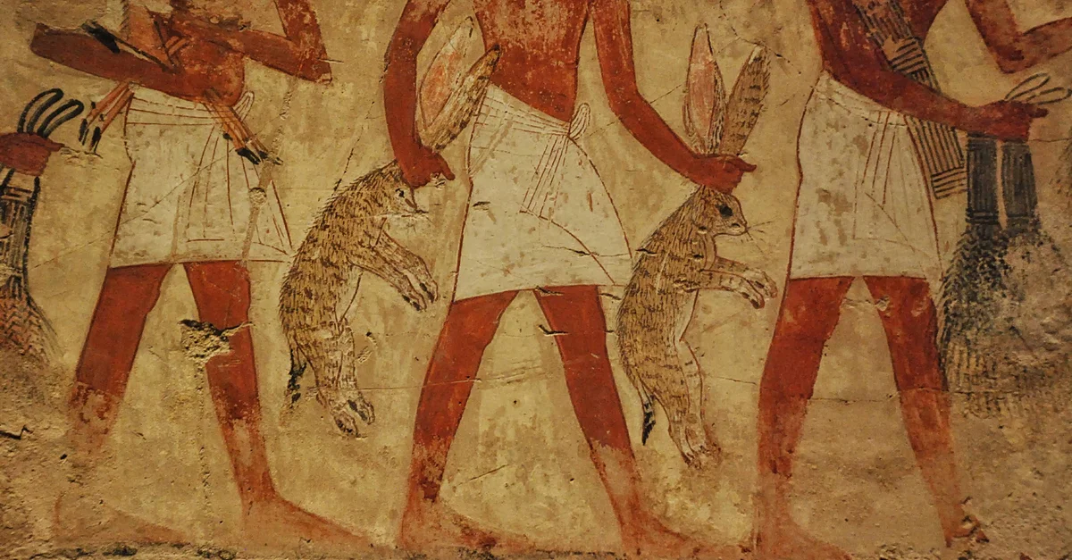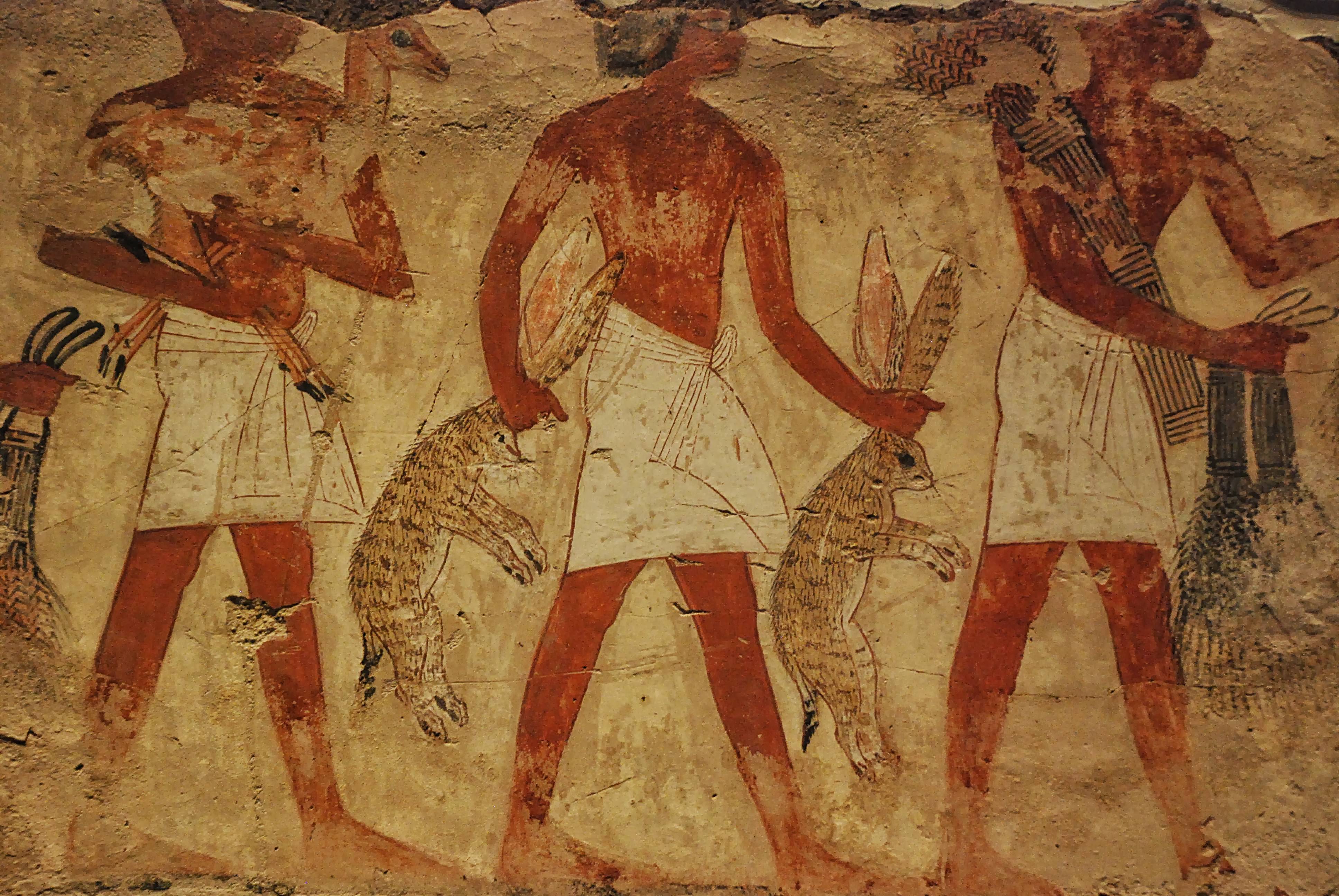 An Egyptian servant is carrying two desert hares as an offering to Nebamun, a rich Egyptian accountant. Detail of a larger procession of agricultural offerings, from the tomb of Nebamun (c. 1350 BCE).