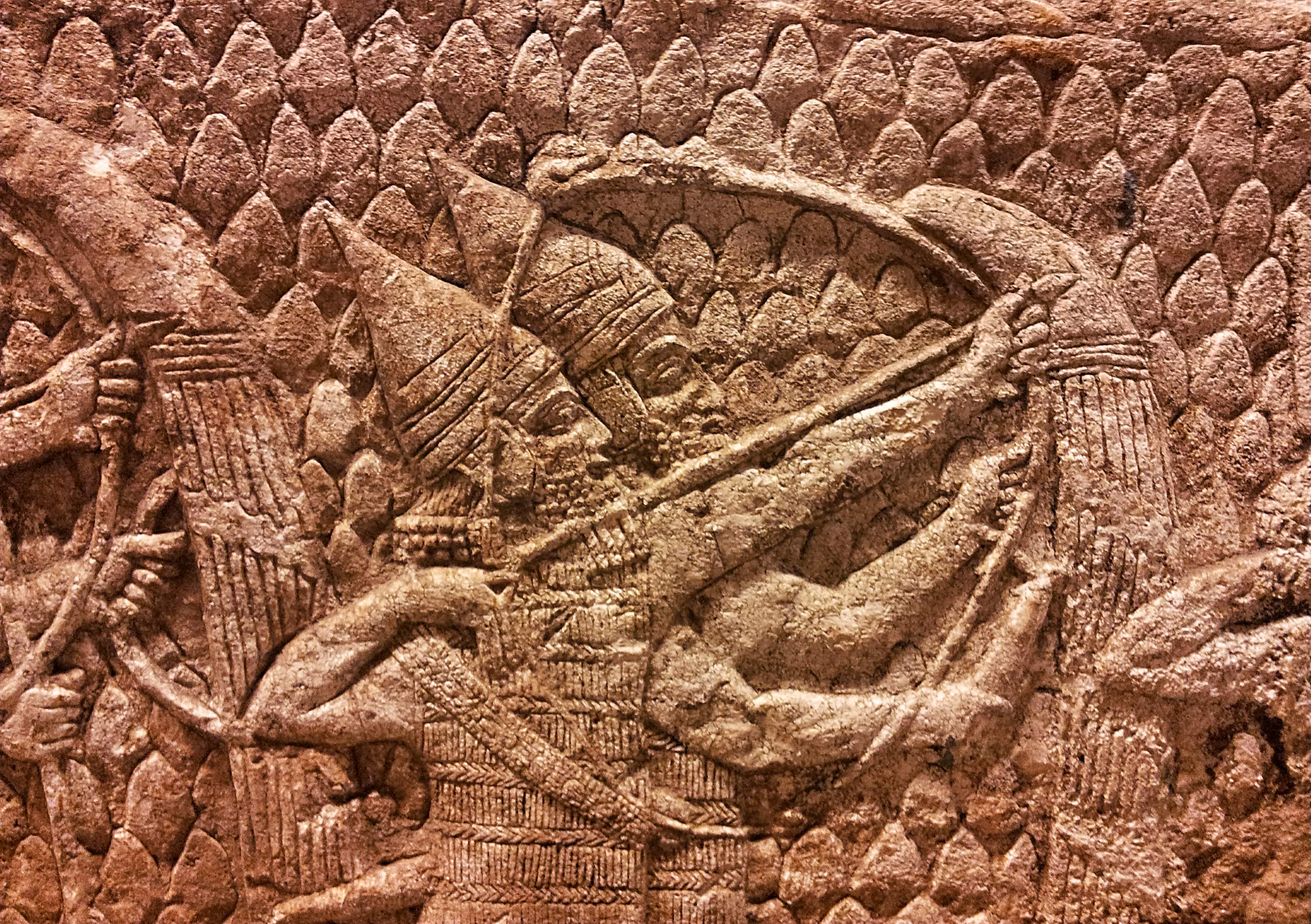 Assyrian archers firing on the enemy during the siege of Lachish. Each archer was protected from enemy fire by a shield bearer. The pointy pattern in the background means that this scene is happening in the mountains. They represent the army of King Sennacherib of Assyria (reigned 705-681 BCE) marching on Lachish, an ancient town about 40 km from Jerusalem. This image is part of a series of reliefs depicting the siege and capture of the town, from the walls of Sennacherib's palace in Nineveh. Palace relief, c. 700-692 BCE. British Museum, London, UK.