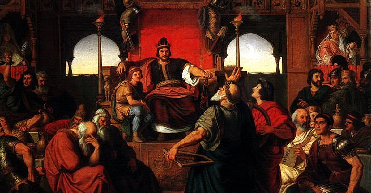 Feast of Attila by Mor Than, 1870 CE, now in the Hungarian National Gallery. In this scene, visitors stand before Attila and his guests, singing songs that they have composed. Attila in at the center of the composition, it is thought that the man to his left is his son, and the women at the top of the composition are his wives. Priscus, who wrote "Byzantine History" from which this scene comes, sits on the right holding a book.