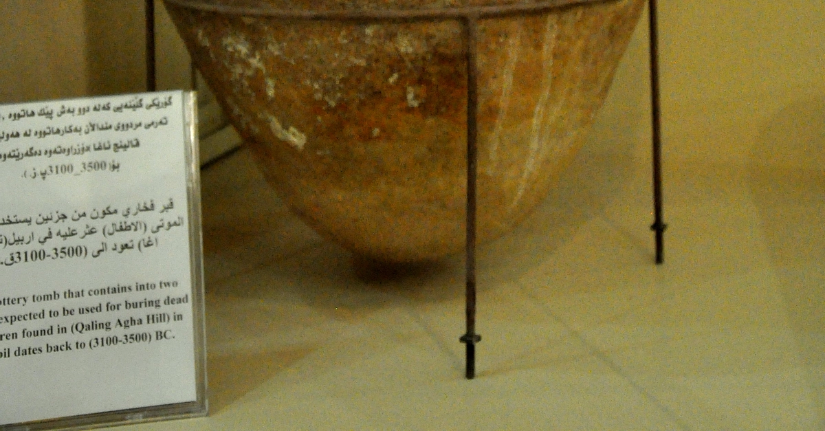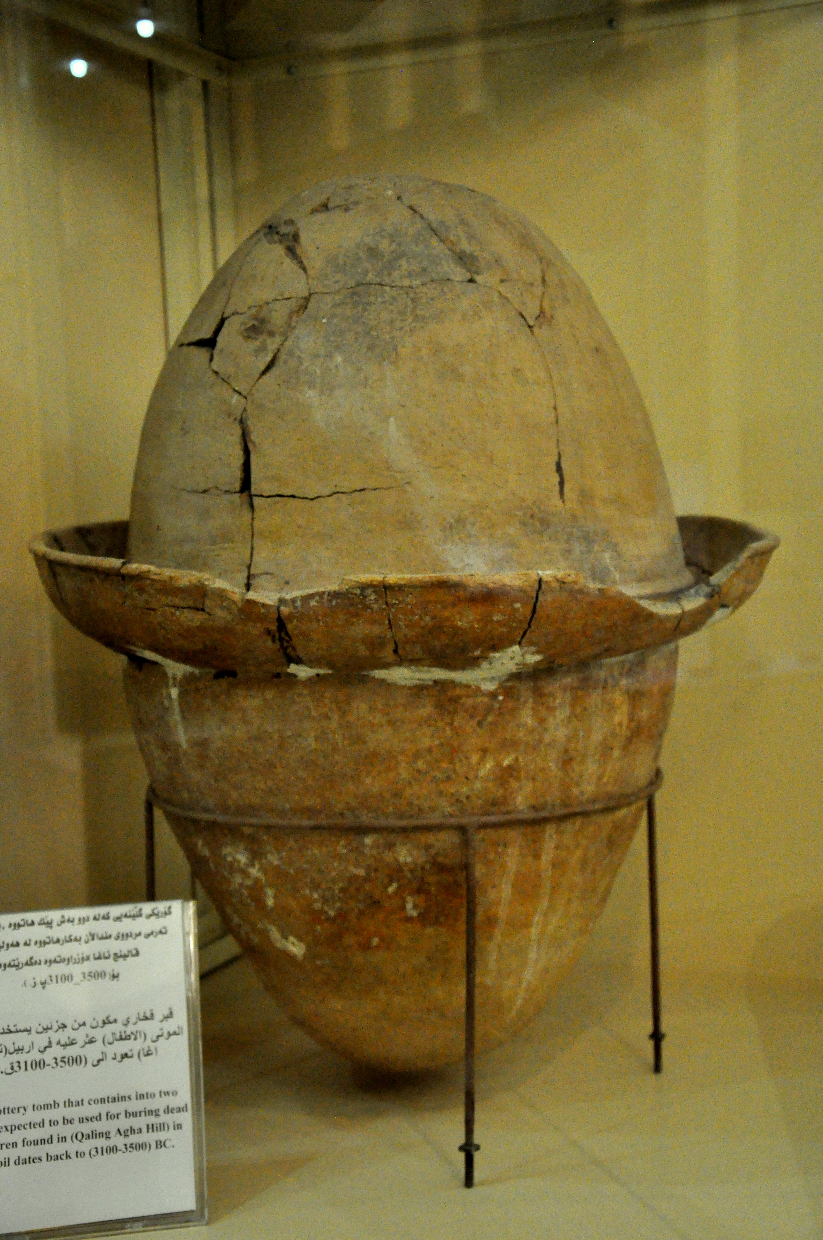 This pottery tomb is composed of two parts and is in the shape of an egg. It was probably used for burying dead children. From Tell Qaling Agha at modern Erbil Governorate, Iraq. 3500-3100 BCE. Erbil Civilization Museum, Iraq.