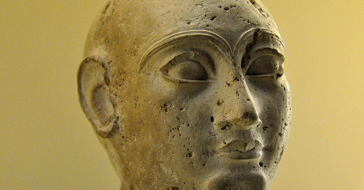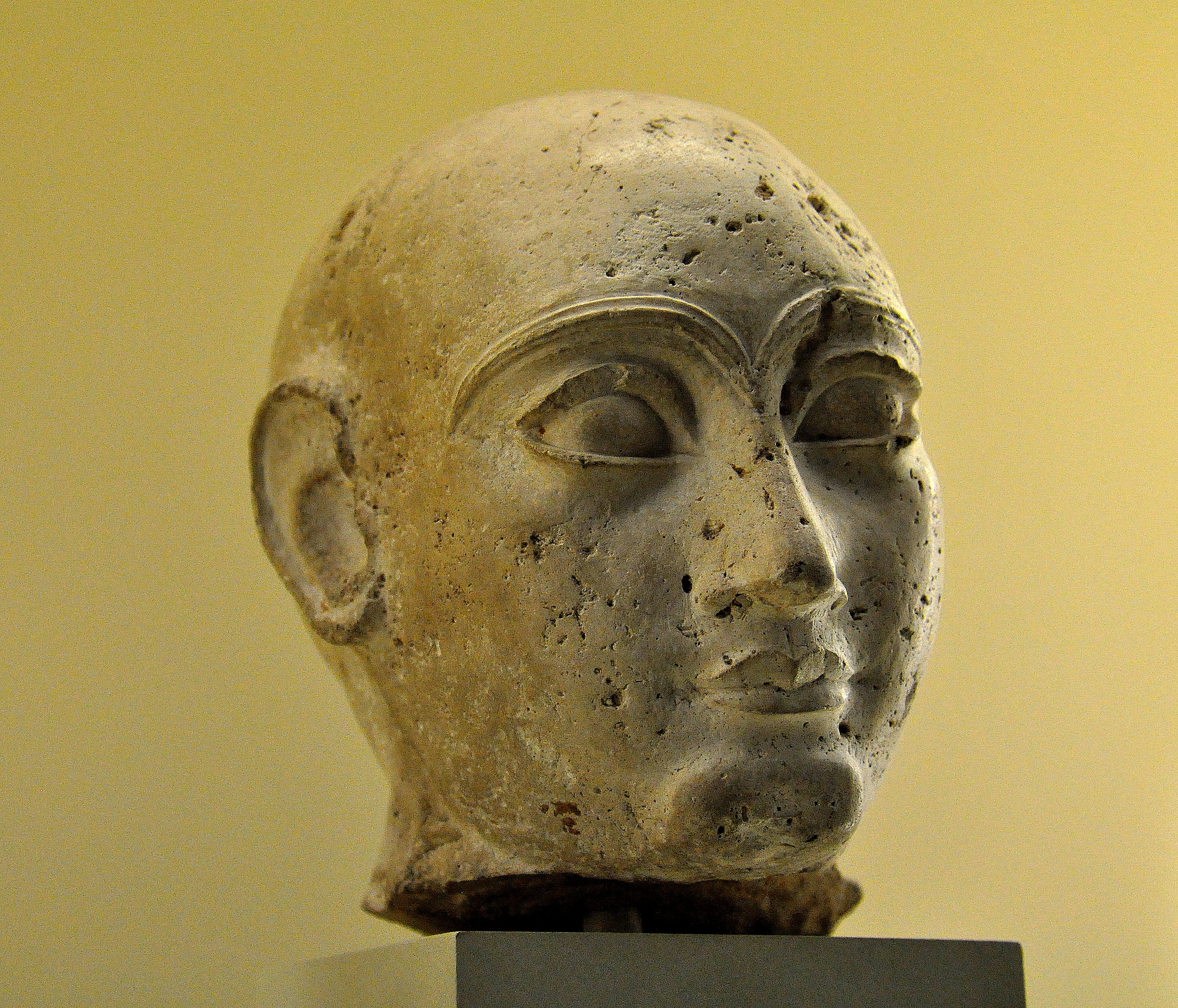 Limestone head of a statue, probably Gudea, ruler of Lagash. The rest of the body is missing. Probably from Tell Telloh (ancient Girsu), southern Mesopotamia, Iraq. 2144-2124 BCE. (The Pergamon Museum, Berlin).