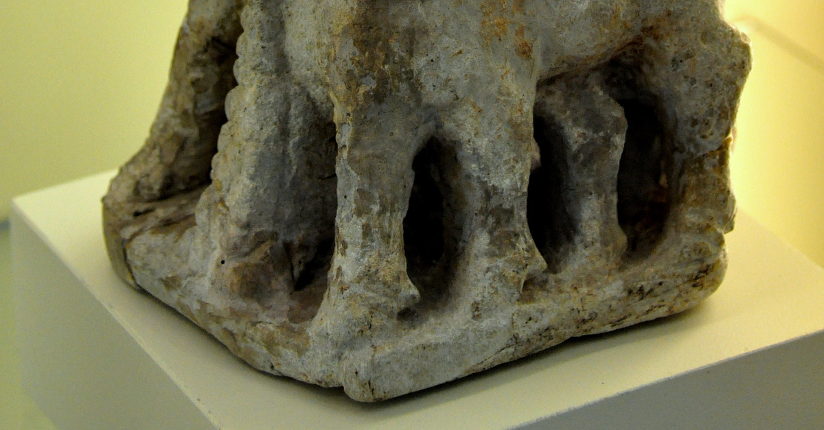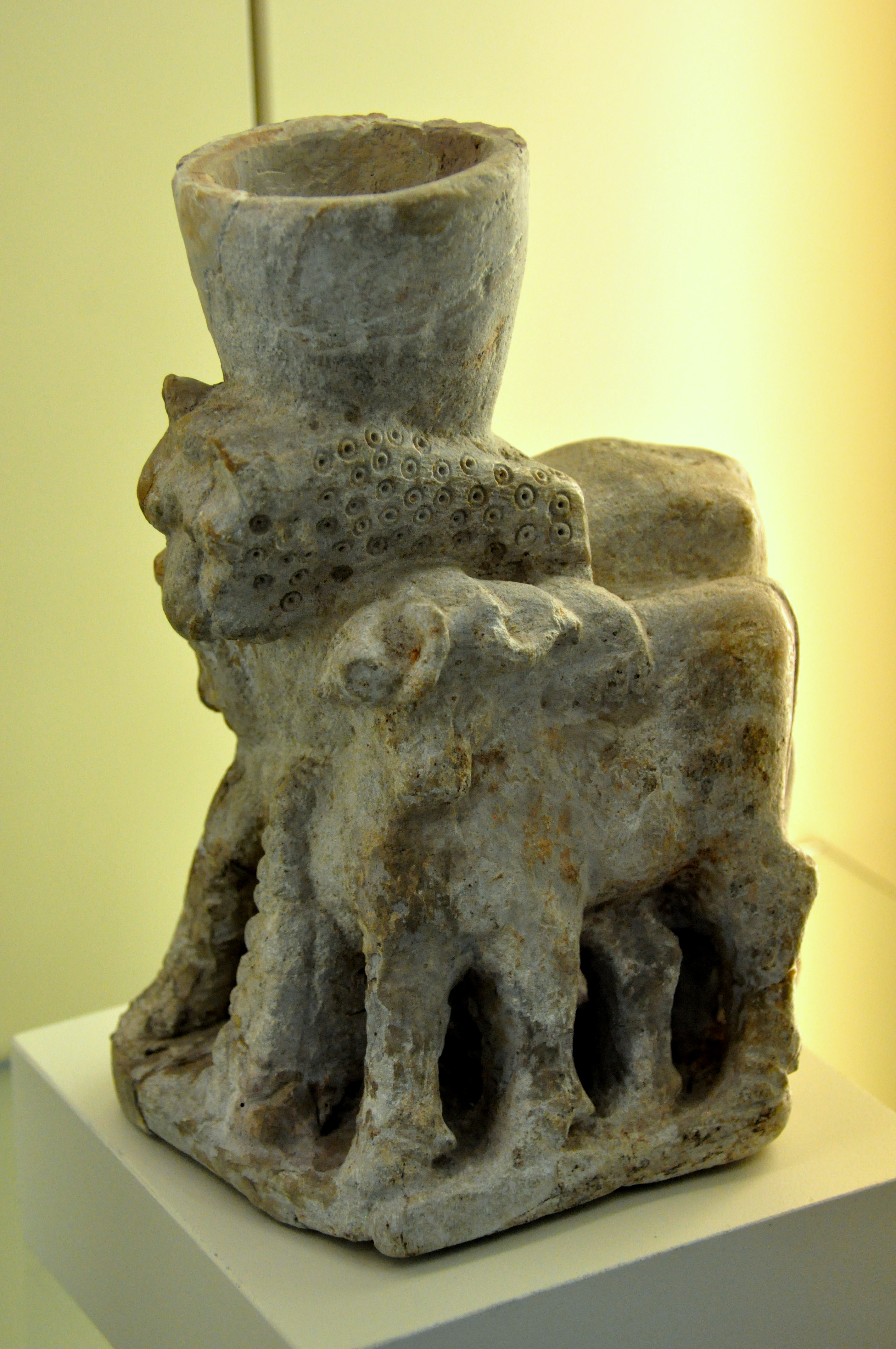 A soapstone sculpture depicting a cup fixed on the back of standing animals. From Mesopotamia (modern-day Iraq); location and date of excavation are unknown. Circa 3000 BCE. (The Pergamon Museum, Berlin).