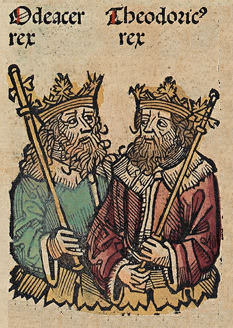 Woodcut depiction of Theodoric and Odoacer from the Nuremberg Chronicle, 1493 CE, written in Latin by Hartmann Schedel, translation into German by Georg Alt, now in the Bavarian State Library.