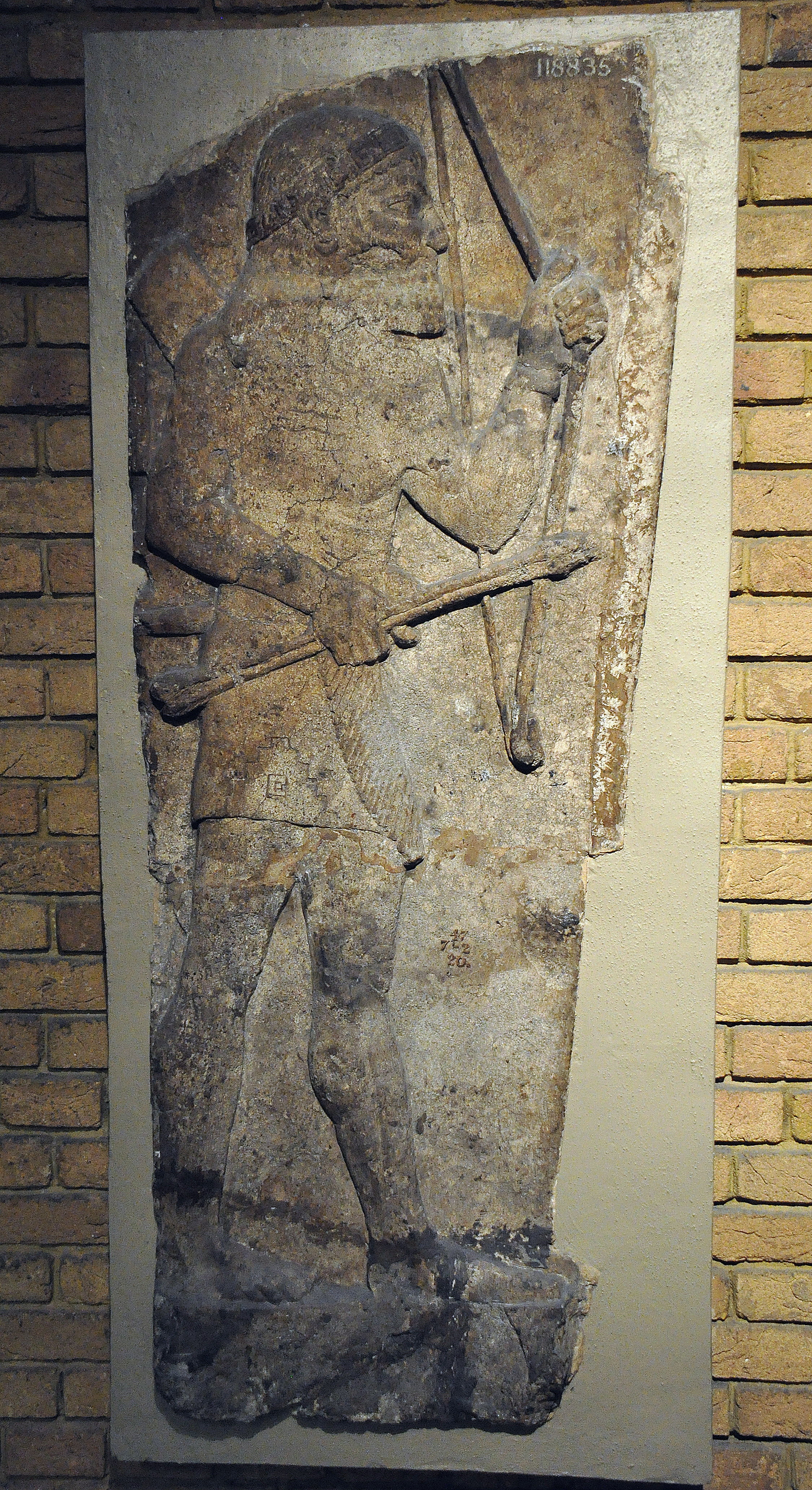 This gypsum relief, which depicts an archer, was part of a larger wall relief that demonstrates the Assyrian army and Sargon II's attack on the city of Amqaruna (Biblical Ekron) in central Palestine, probably in 720 BCE. The archer holds a bow and arrows and wears a loin-cloth with fringe; obviously he is not an Assyrian soldier (an enemy?). From the palace of Sargon II at the city of Khorsabad (ancient Dur-Sharrukin), northern Mesopotamia. Iraq. Neo-Assyrian period, 710-705 BCE. (The British Museum, London).