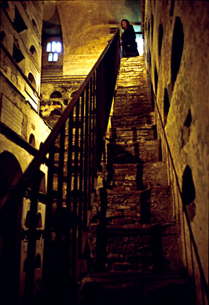 Staircase leading to the underground chamber of Columbarium 1, Rome. The central pillar supporting the ceiling is at left.