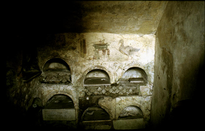This fresco is on the first landing of the columbarium discovered in 1852 CE at the Vigna Codini, on the strip of land between Via Latina and Via Appia. The fresco has crumbled from the wall, revealing the first-century CE opus reticulatum brickwork. The urns in these loculi were properly concealed beneath a marble revetment.