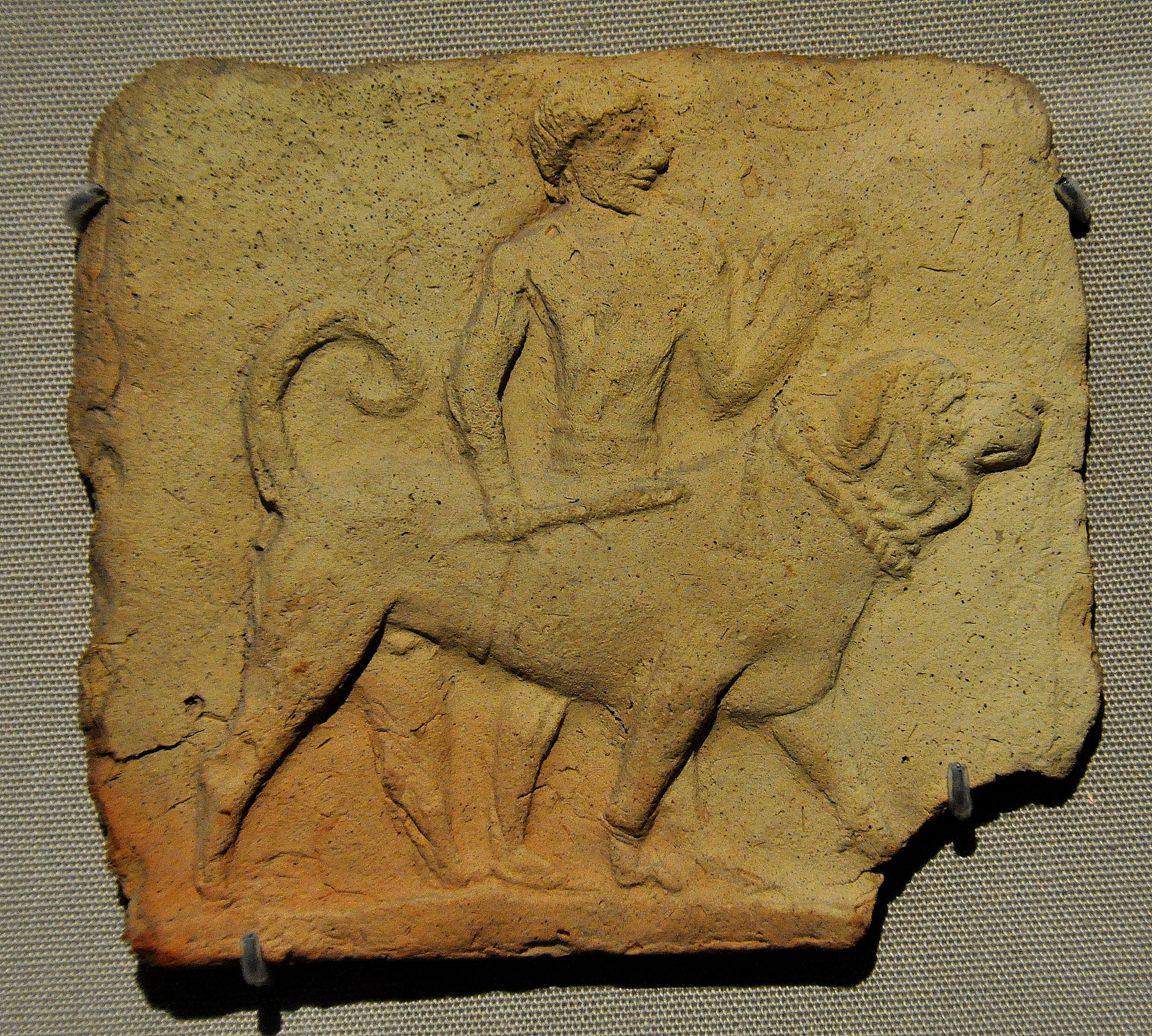 This clay plaque depicts a striding man who leads a large dog (domestic scene?). From Sippar (modern-day Tell Abu Hubba, Babel Governorate, Iraq), Mesopotamia. Old-Babylonian period, 2000-1600 BCE. (The British Museum, London).