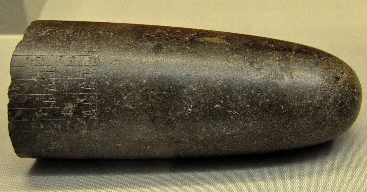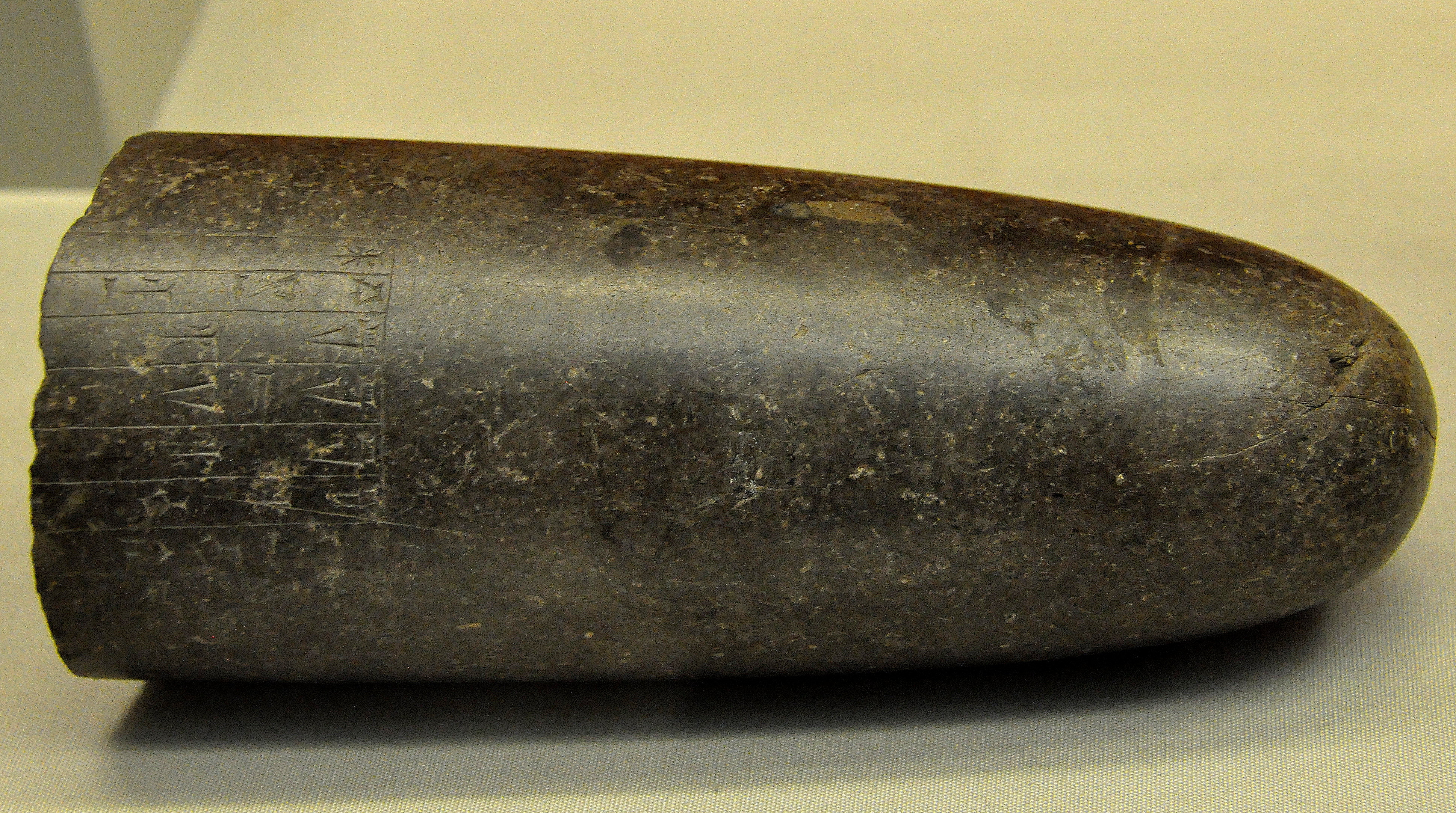 The inscription, unusually for a weight, is cut in reverse. It mentions that this stone weight was dedicated to the temple of Shamash, the sun god, at Sippar. It precisely gives the weight as 10 mina, 15 shekels, a little more than 5 kilograms. From Sippar (modern Tell Abu Habba, Babel Governorate, Iraq), Mesopotamia. Circa 1400-1200 BCE. (The British Museum, London).