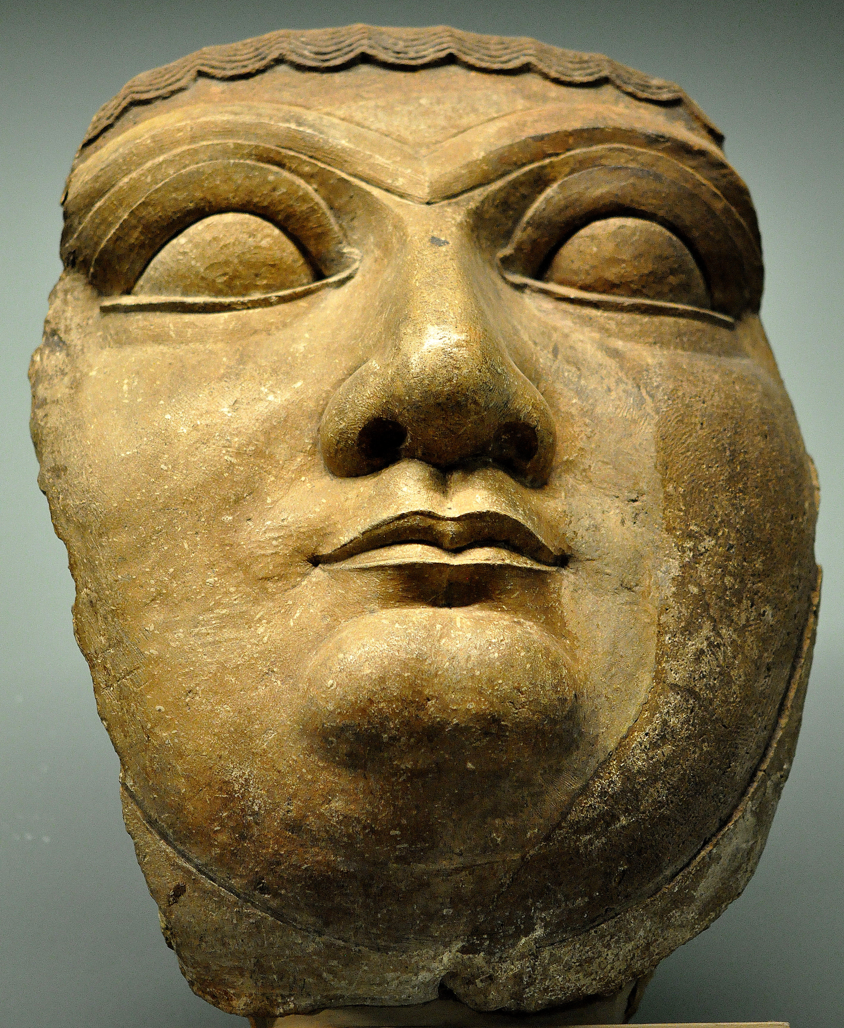 This carved stone face probably belonged to a head of a sphinx. The Assyrian king Sennacherib ordered several colossal statues to be made in his new palace. Such giant statues were thought to have a supra-natural protective power. From the south-west palace at Nineveh (modern Ninawa Governorate, Iraq), northern Mesopotamia. 700-695 BCE. (The British Museum).