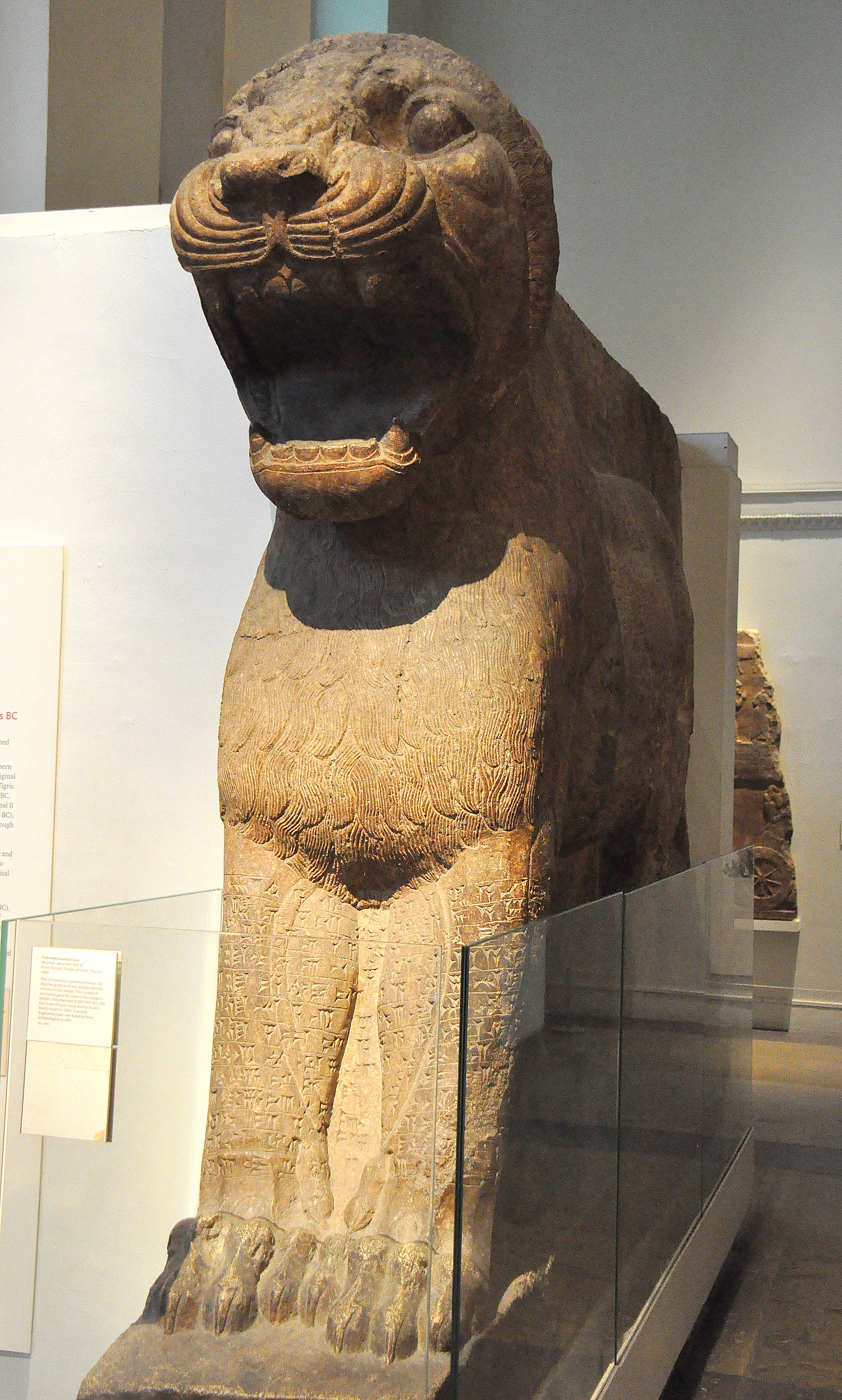 Colossal guardian lion found at the entrance to the temple of Ishtar, Sharrat-niphi. The cuneiform inscriptions on the statue mention the name of Ashurnasirpal II as the temple's builder. This lion was one of a pair of lions which were found by Sir Henry Layard in 1850 and excavated by Iraqi archaeologists in 2001. From Nimrud (ancient Kalhu), Mesopotamia, modern-day Iraq, Neo-Assyrian Empire, 865-860 BCE.