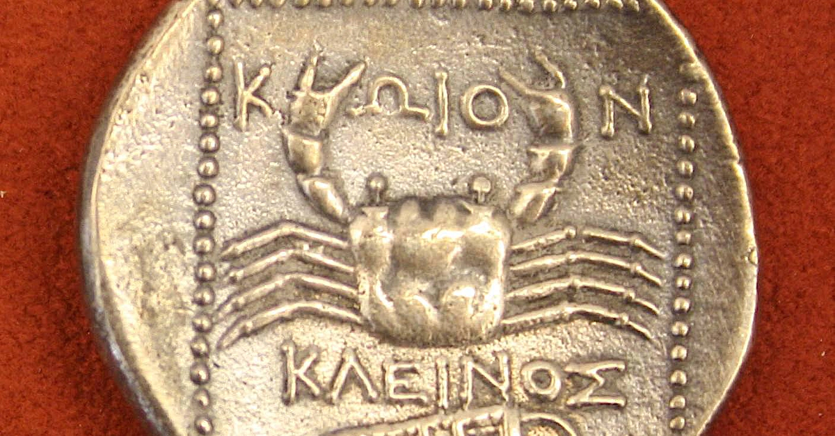 A silver tetradrachm from Kos, 300-190 BCE. O: Hercules, R: Crab. (Alpha Bank Numismatics Museum, Kerkyra, Corfu)