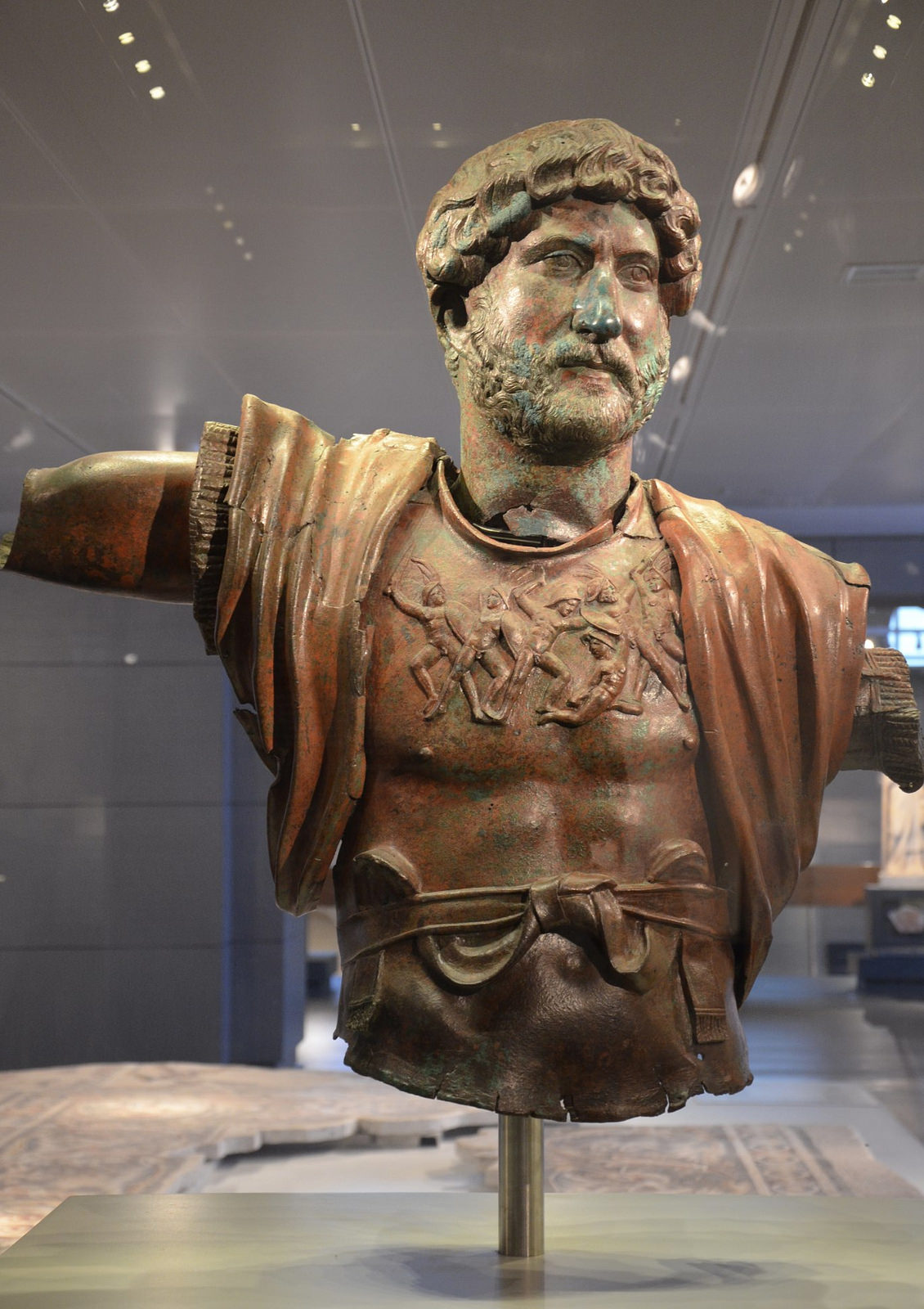 Bronze statue of Hadrian, found at the Camp of the Sixth Roman Legion in Tel Shalem (Israel). It was found by chance by an American tourist in 1975 while searching for ancient coins with a metal detector. Tel Shalem was once occupied by a detachment of the Sixth Roman Legion (Legio VI Ferrata). The 50 fragments of this statue were found in a building which stood at the center of the camp, perhaps in the principia (the headquarters building). The statue was erected between 132 and 135 CE. (Israel Museum, Jerusalem)