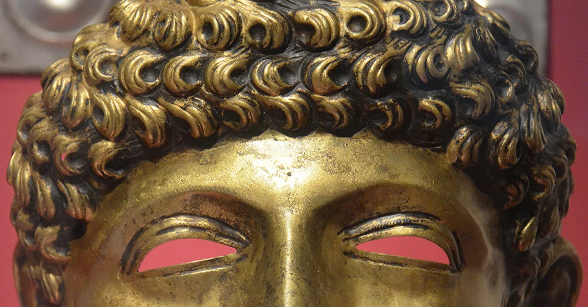 Golden Cavalry Face-Mask Helmet (Type Ribchester) dating from 80-125 CE, found on the bed of the Corbulo Canal (Fossa Corbulonis) near the Roman fort of Matilo (modern Leiden). (Rijksmuseum van Oudheden, Leiden, Netherlands)