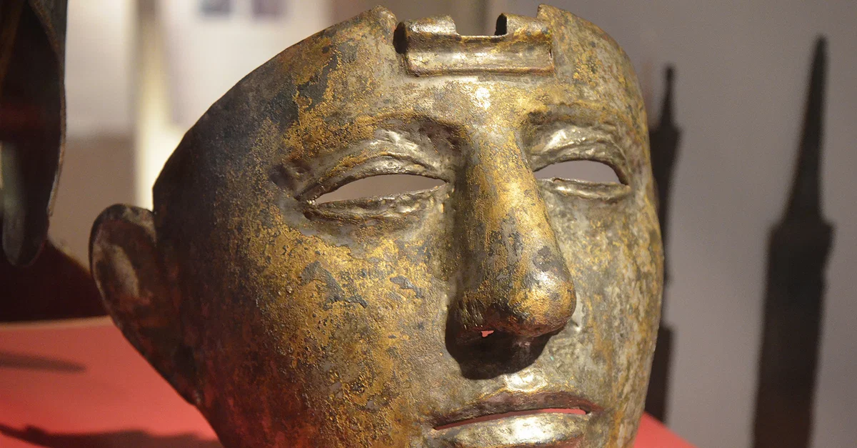 Cavalry Face-Mask Helmet (Type Nijmegen-Kops Plateau), brass sheet on iron core, dating to the 1st or 2nd century CE. (Rijksmuseum van Oudheden, Leiden, Netherlands)