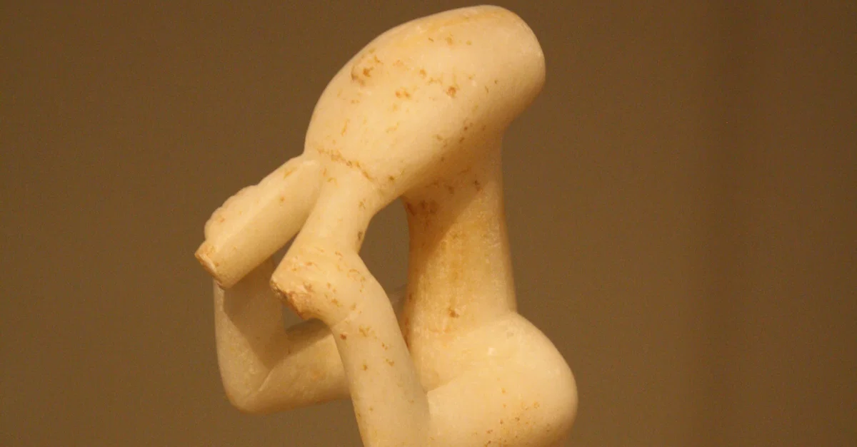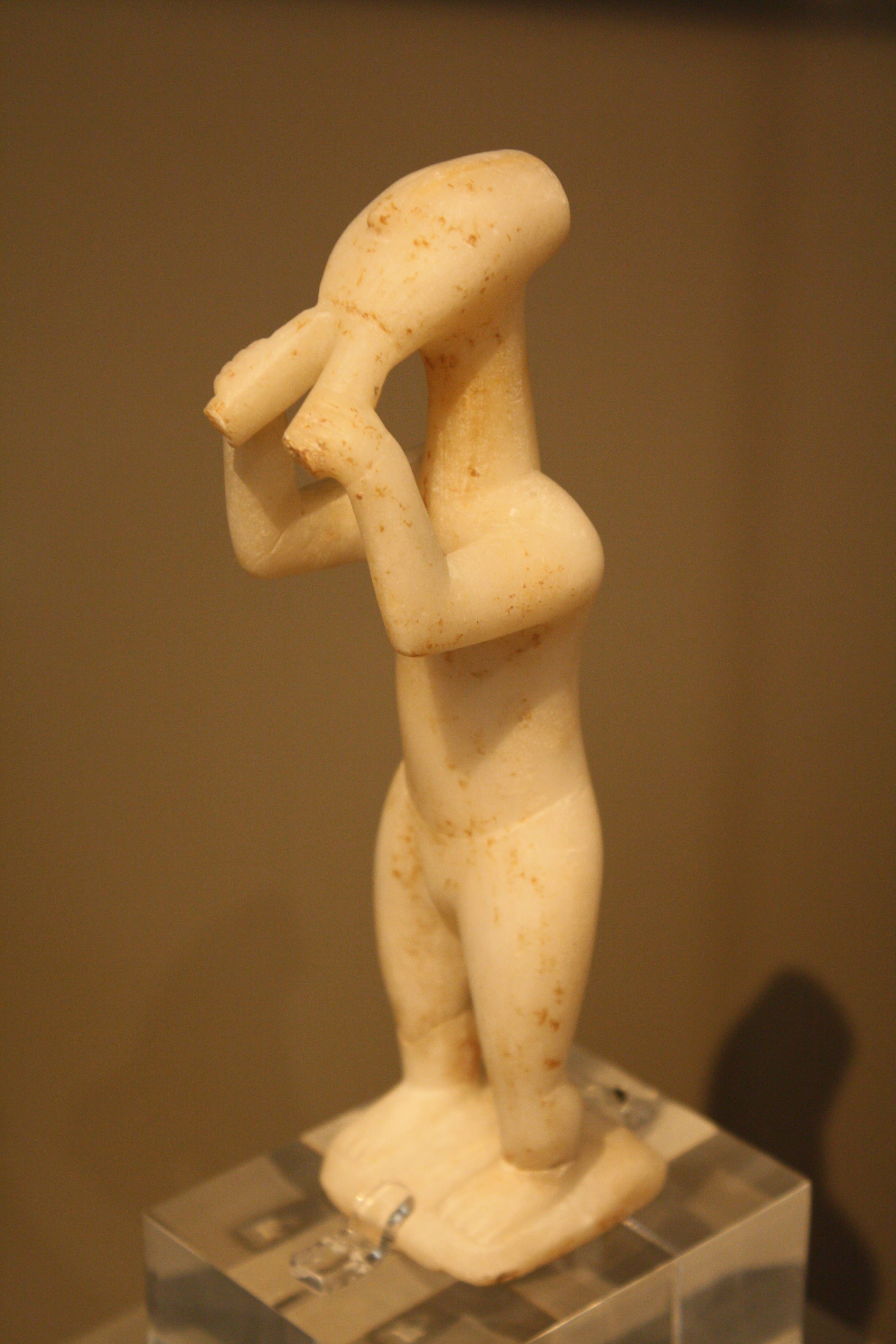 A marble figurine from the Cycladic islands, 2800-2300 BCE, depicting a flute or aulos player. It is one of the earliest representations of a musician in sculpture from the Bronze Age Aegean. (National Archaeological Museum, Athens).