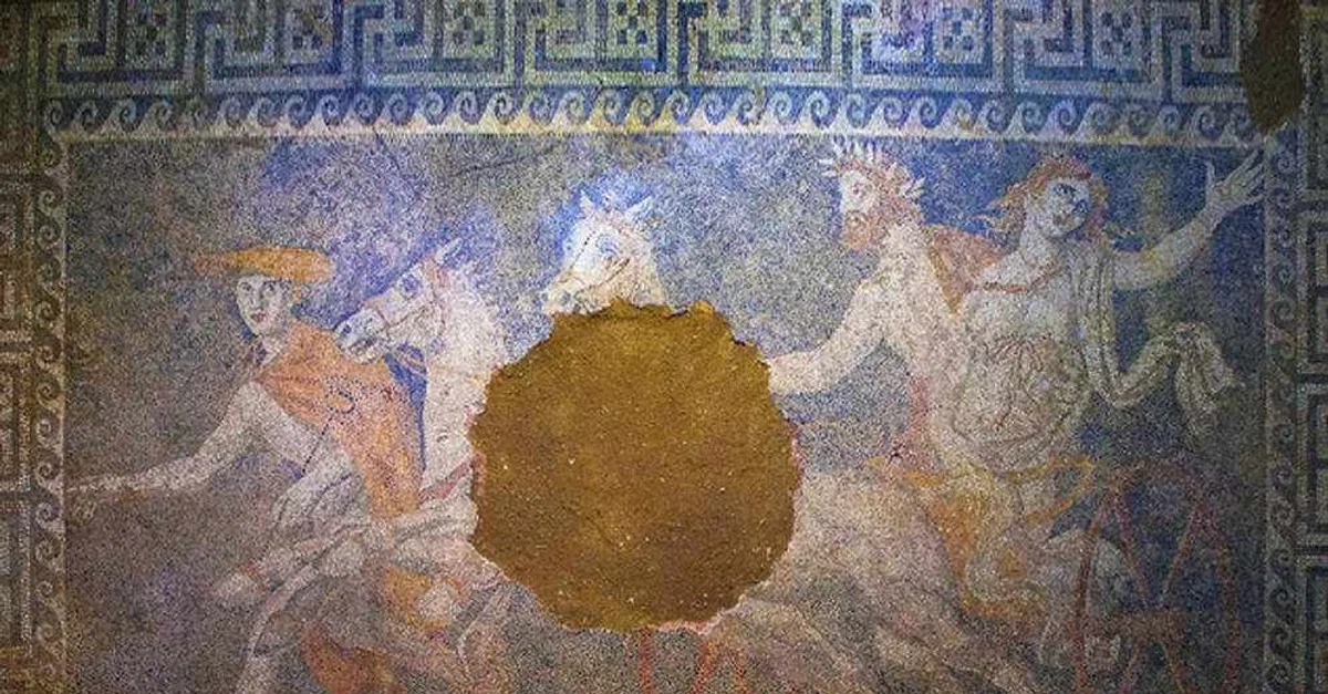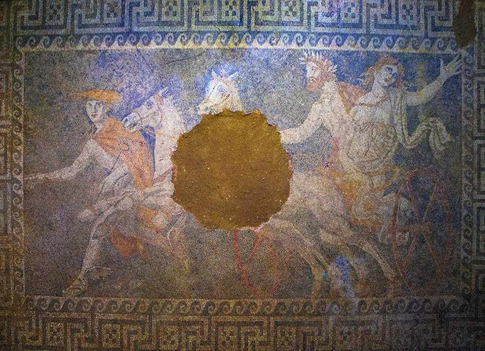 A mosaic from a large Hellenistic Period tomb at Amphipolis depicting the abduction of Persephone by Hades from Greek mythology.
