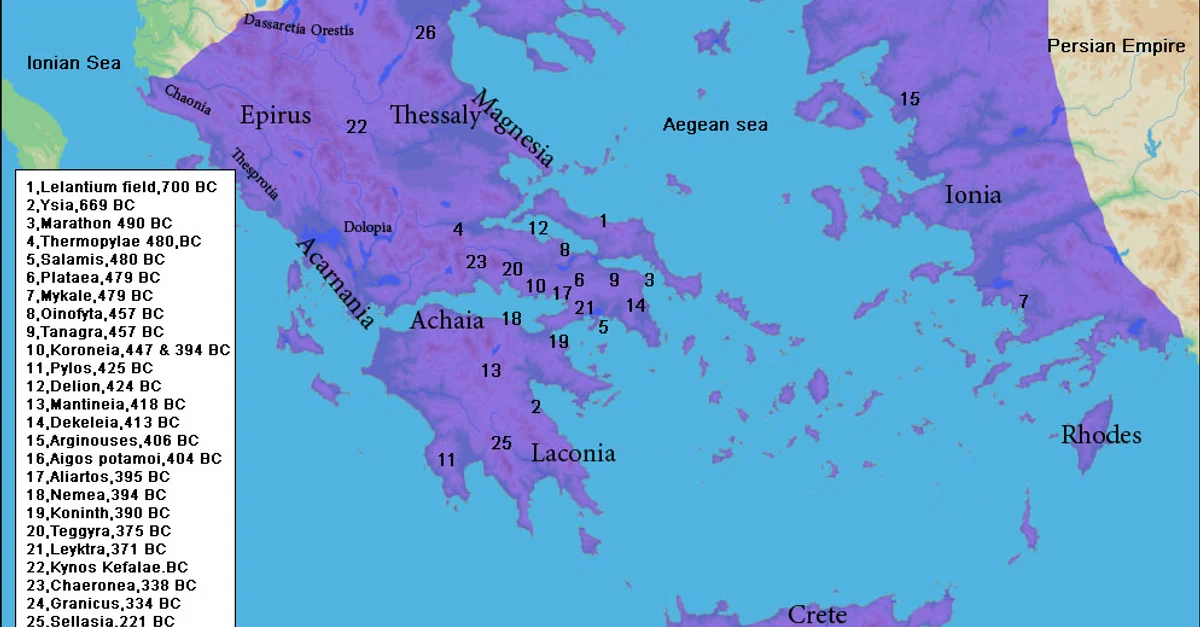 A map showing the locations of battles in ancient Greece.
