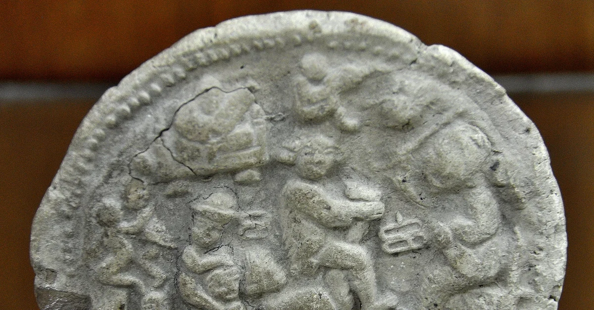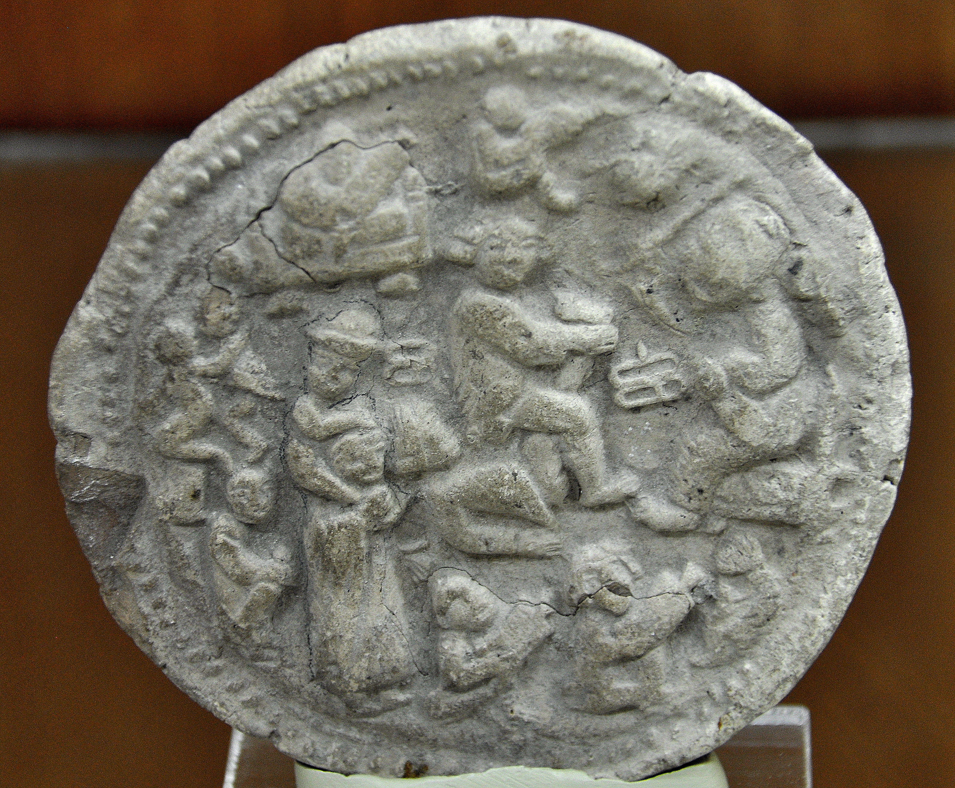 This round pottery plaque depicts various human daily activities. In the middle, a man and a woman are having sex, and on the left, a standing woman holds a young child on her shoulders. Hellenistic Period, 323-30 BCE. From Mesopotamia, modern-day Iraq. The Sulaimaniya Museum, Iraq.
