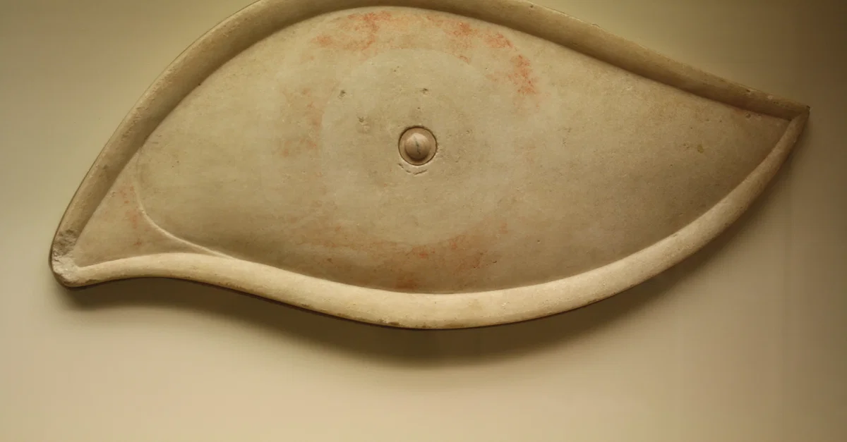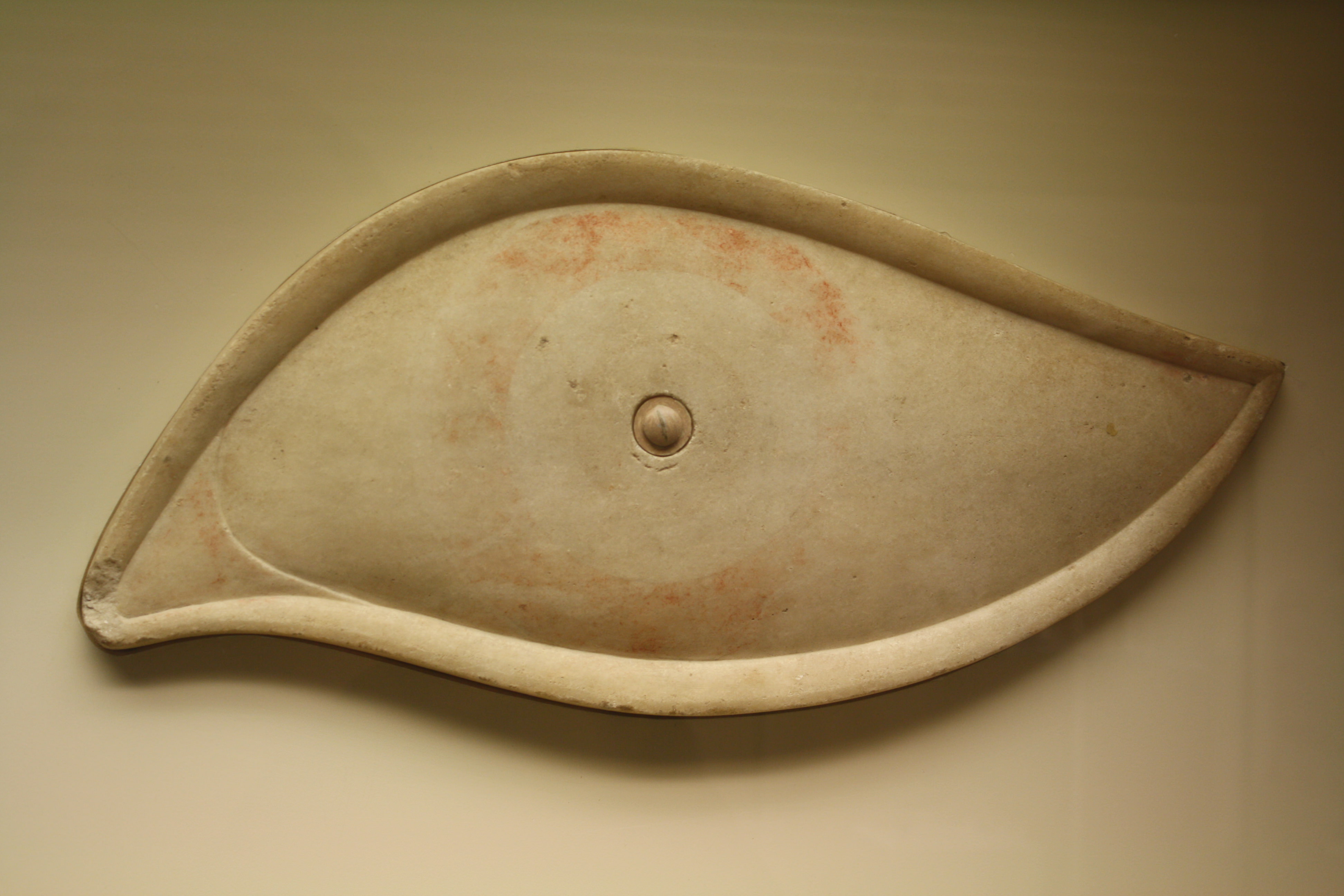 A marble eye which was once attached to the prow of a trireme in order to ward off evil. Traces of the original paint can still be seen. (Archaeological Museum of Piraeus)
