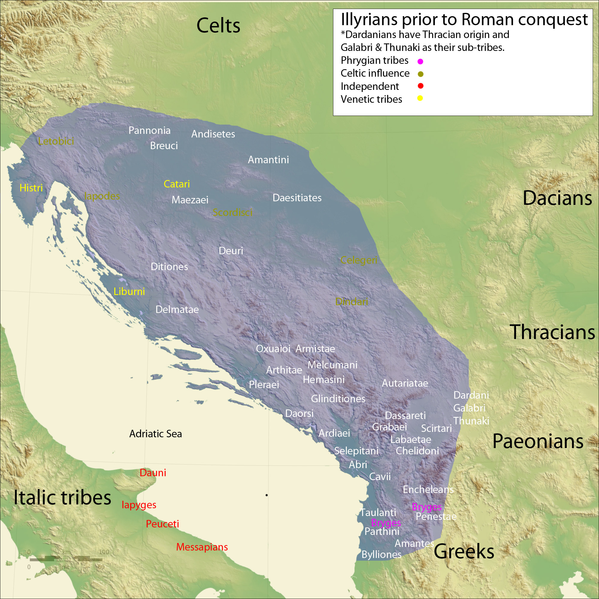 A map showing the Illyrian tribes prior to Roman conquest, including Phrygian tribes, Venetic tribes, independent tribes, and those under Celtic influence.