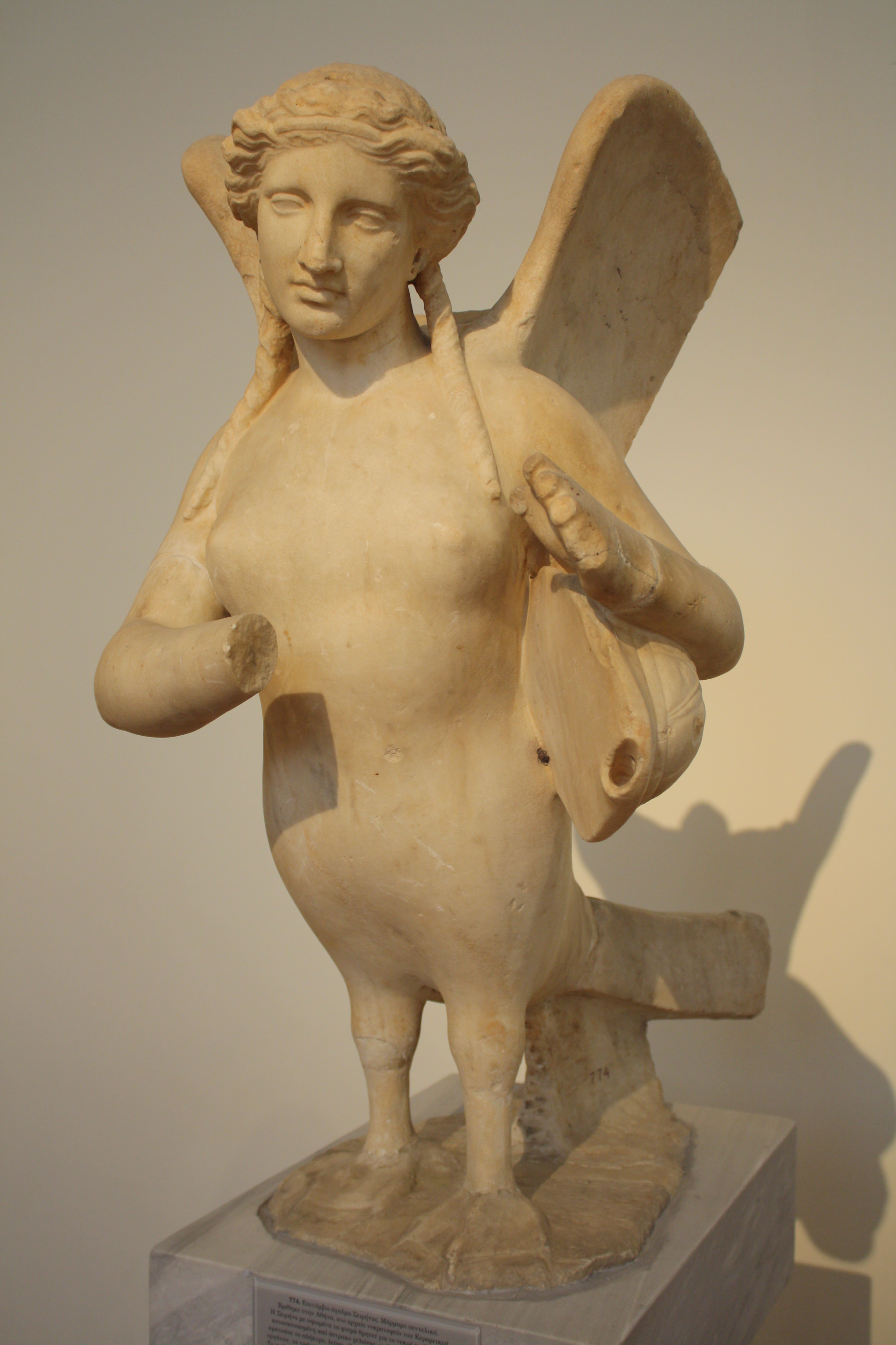 A funerary statue of a siren, 370 BCE. The Greek mythical creature holds the soundbox of a lyre made from a tortoise shell.