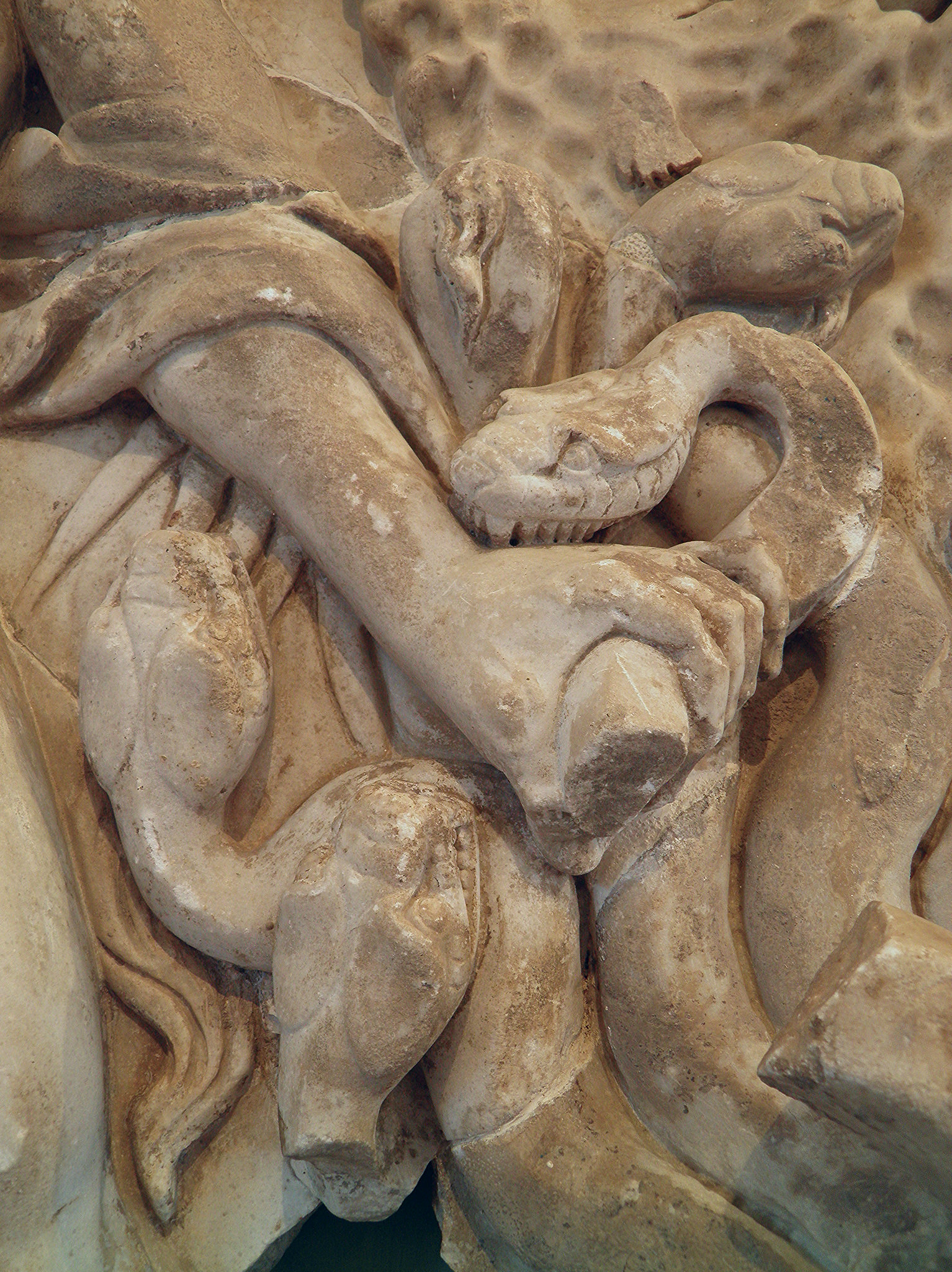Detail of the Chiragan relief depicting Hercules killing the Lernaean Hydra, 2dn/3rd century CE.(MSR, Musée Saint-Raymond, Villa romaine de Chiragan, Musée des Antiques de Toulouse)